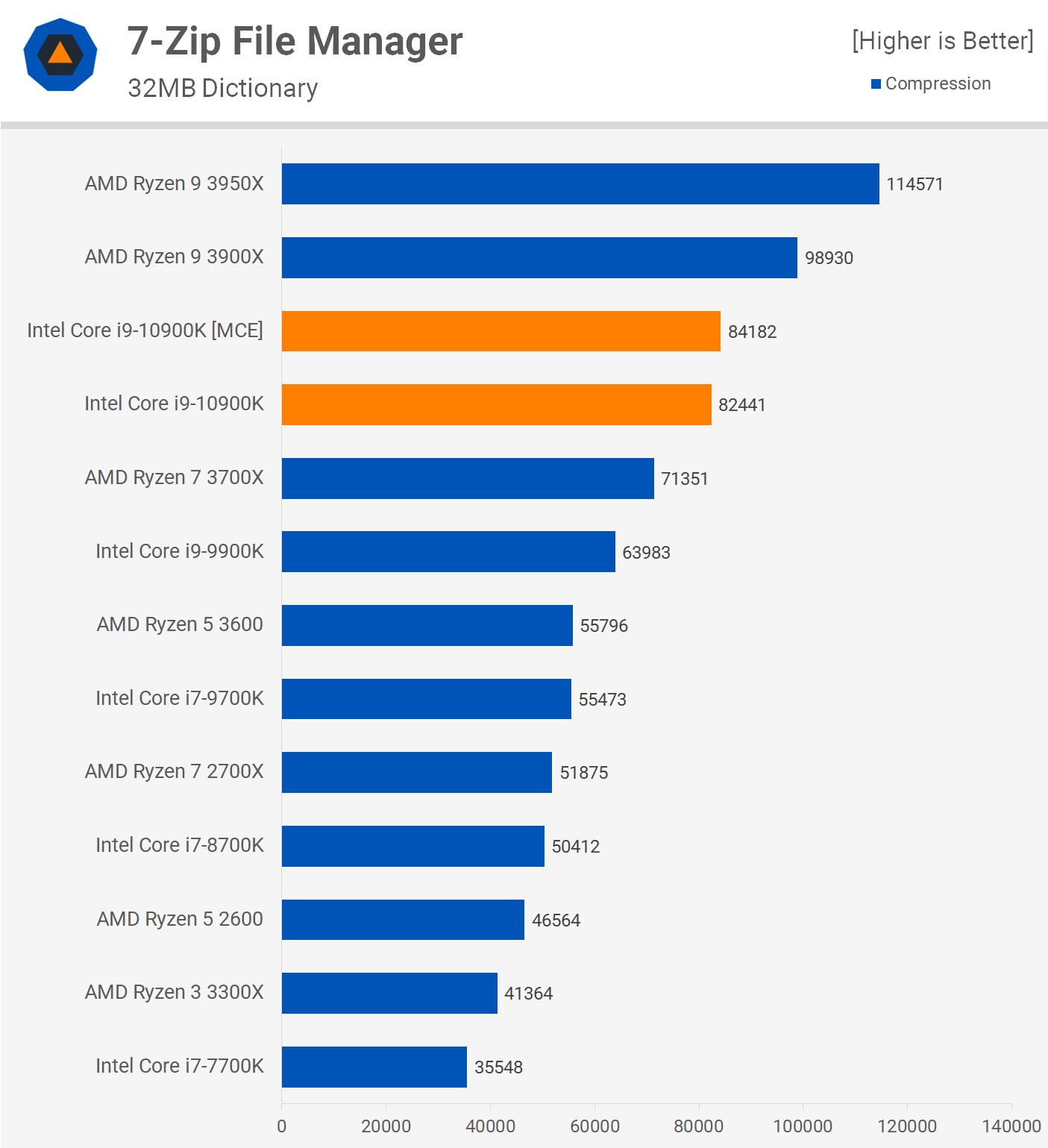 Passant au test de compression à 7 zip, nous voyons ici que le 10900K se trouve une fois de plus positionné entre le 3700X et le 3900X, bien qu'il soit plus proche de la partie à 8 cœurs en termes de performances. Ici, le 10900K était à peine 16% plus rapide que le 3700X, ce qui le rend 17% plus lent que le 3900X.
