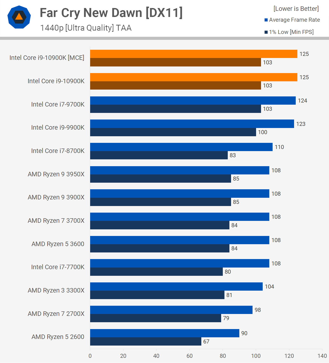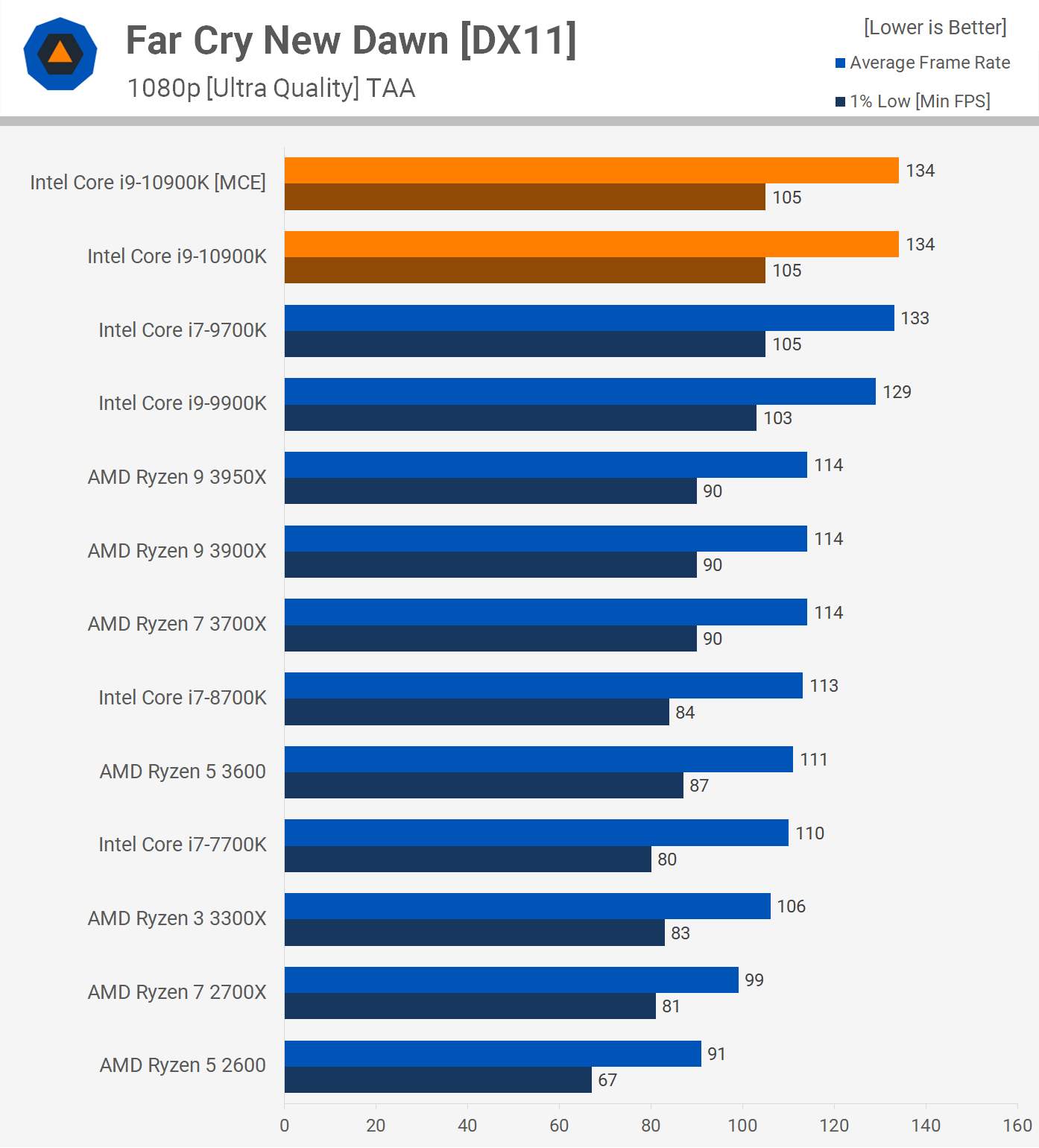 Far Cry New Dawn met en évidence un pire scénario pour Ryzen et ici le 10900K est 18% plus rapide que le 3900X, ce qui est une marge importante. Pousser 134 fps en moyenne contre 114 fps sera sans aucun doute plus souhaitable pour les joueurs à taux de rafraîchissement élevé.