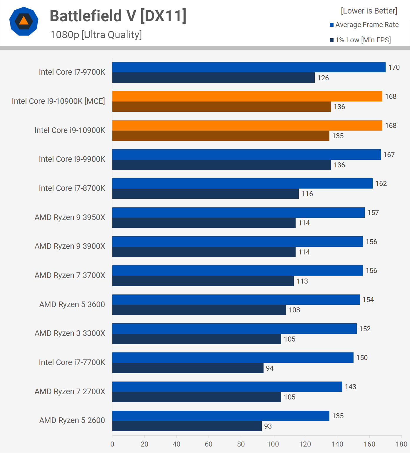 Il est temps de faire quelques repères de jeu, en regardant d'abord Battlefield V testé en 1080p en utilisant le préréglage de qualité ultra avec une carte graphique GeForce RTX 2080 Ti. Ici, le 10900K correspondait essentiellement au 9900K et cela signifiait qu'il était 8% plus rapide que le 3900X, poussant la fréquence d'images moyenne de 156 images par seconde à 168 images par seconde.