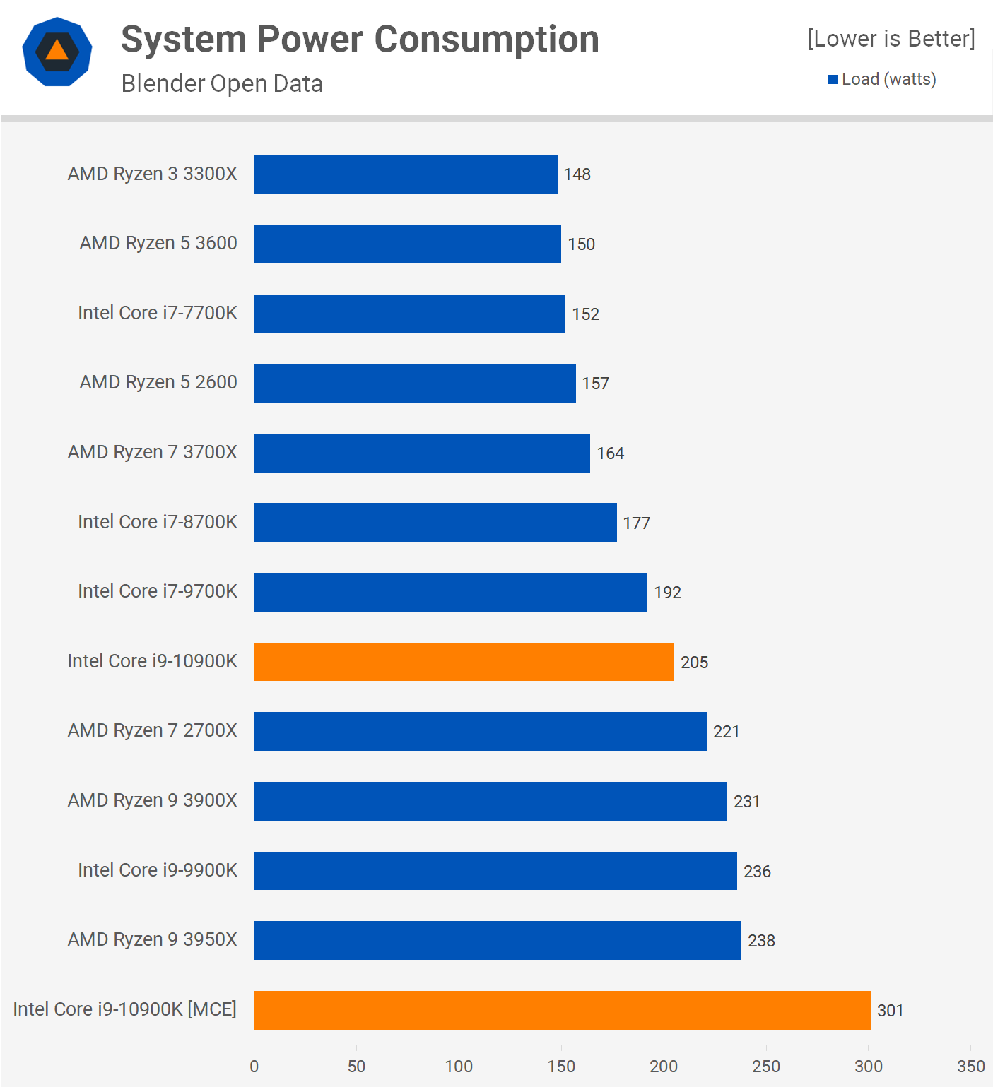 Il y a aussi la question des performances par watt, et en raison de circonstances malheureuses qui ont vu Intel bloqué sur le processus de 14 nm pendant beaucoup plus longtemps que prévu, le 10900K est très gourmand en énergie. Pour la plupart, nous ne voyons pas que ce soit trop un problème, l'utilisation d'un refroidisseur décent gardera le CPU Comet Lake à 10 cœurs assez cool, mais il utilise toujours beaucoup plus de puissance et dans des applications comme Blender, il le fait donc tout en offrant des performances nettement inférieures.