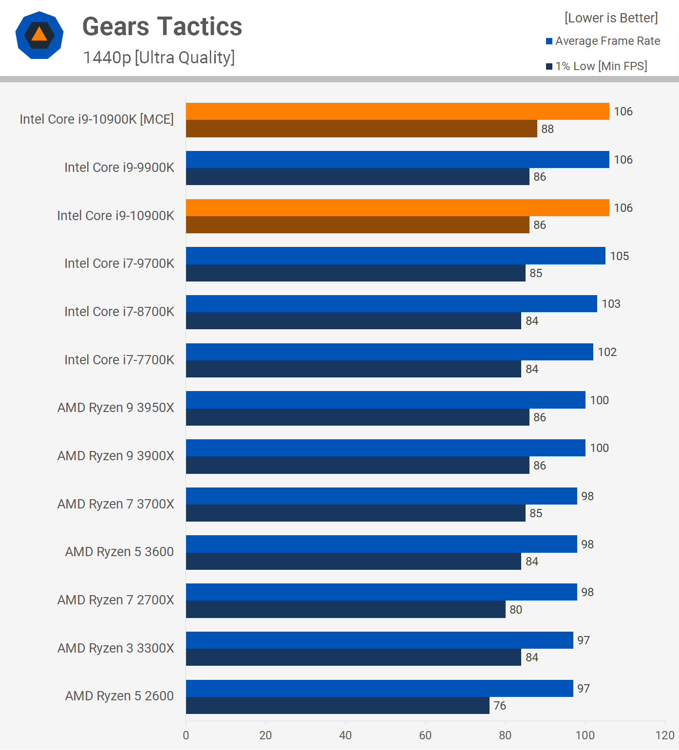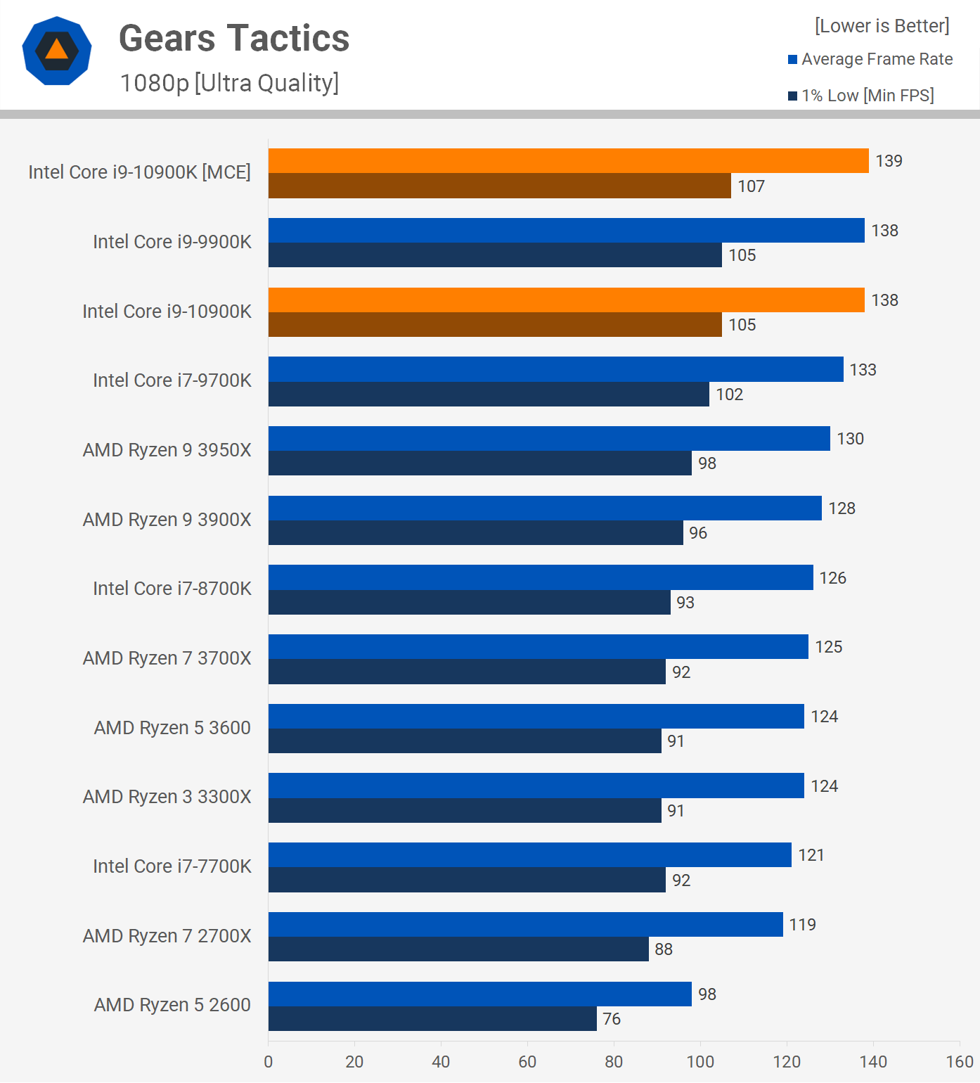 Nous voyons des marges assez typiques dans le nouveau jeu Gears Tactics, ici le 10900K était 8% plus rapide que le 3900X en comparant la fréquence d'images moyenne et 11% plus rapide en comparant les résultats bas de 1%.