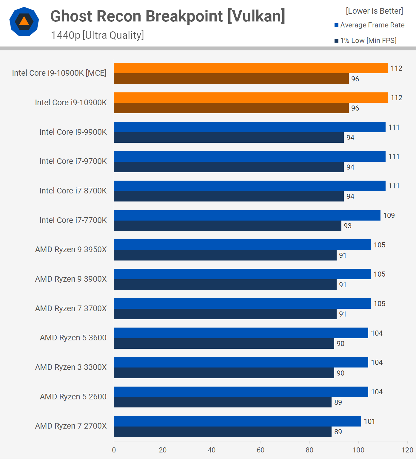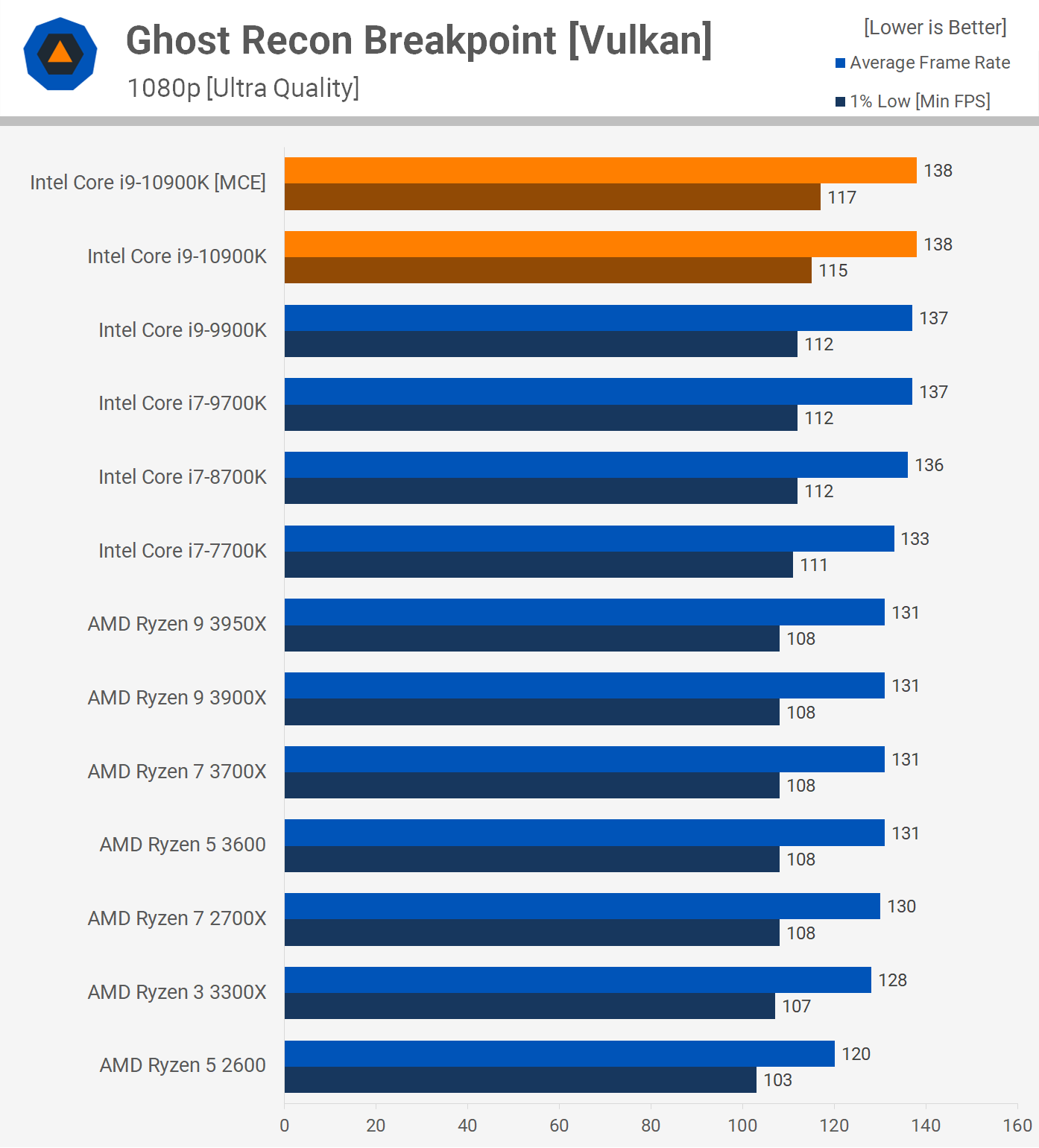 Ghost Recon Breakpoint n'est pas un titre particulièrement gourmand en CPU. Le 10900K était juste 5% plus rapide que le 3900X dans ce jeu et nous dirions que c'est une représentation assez précise des performances de jeu modernes.