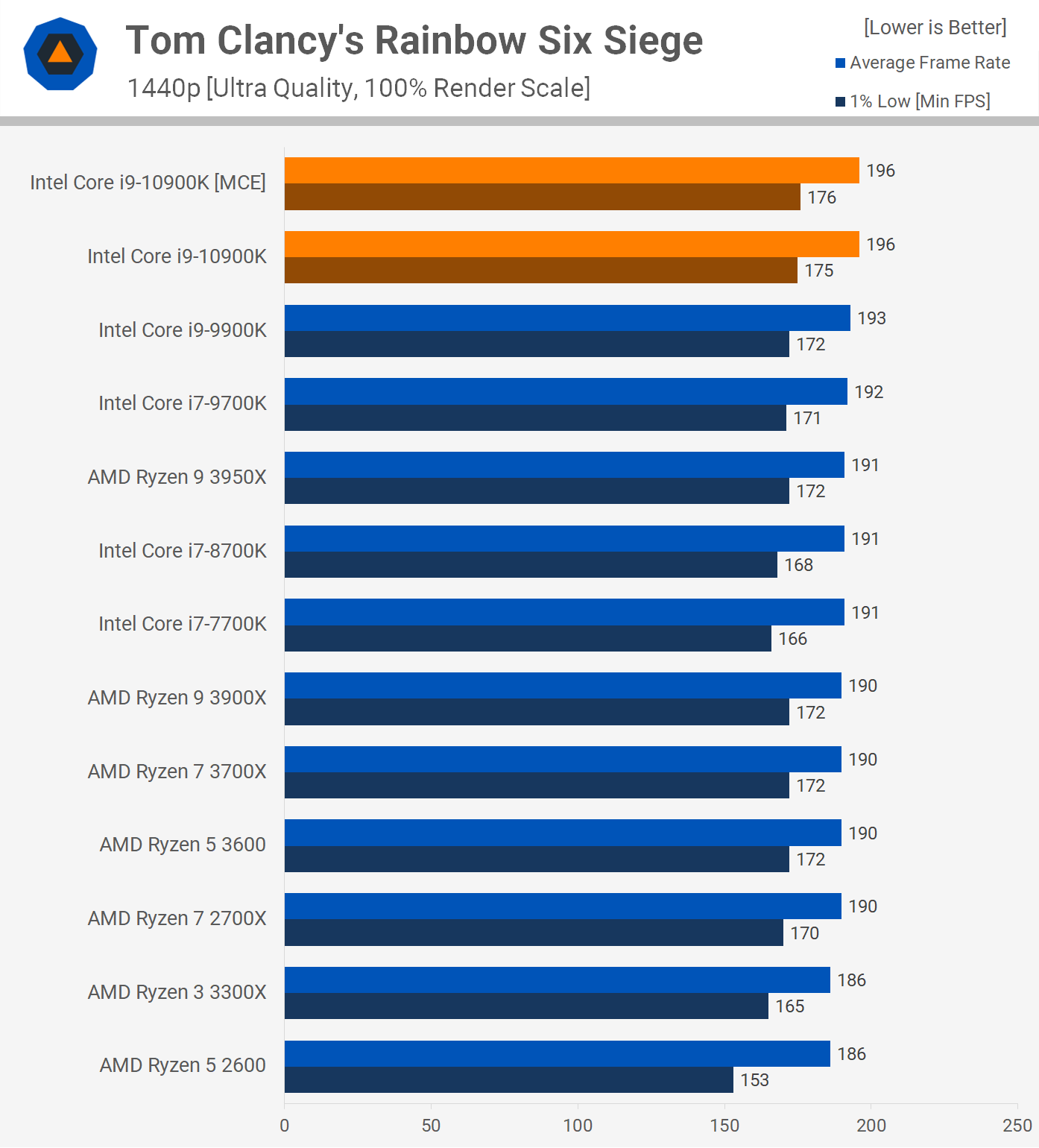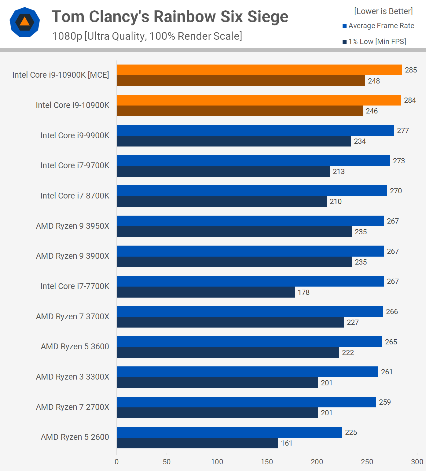 Passant à Rainbow Six Siege, nous envisageons une augmentation de 3% des performances du 10900K par rapport au 9900K, avec une amélioration de 5% des faibles performances de 1%. Pas vraiment époustouflant, mais comme promis par Intel, le 10900K est désormais le processeur de jeu le plus rapide au monde. Il était également à peine 6% plus rapide que le 3900X, mais avec les deux poussant bien plus de 200 images par seconde en tout temps, je ne sais pas à quel point cette marge importe de toute façon.