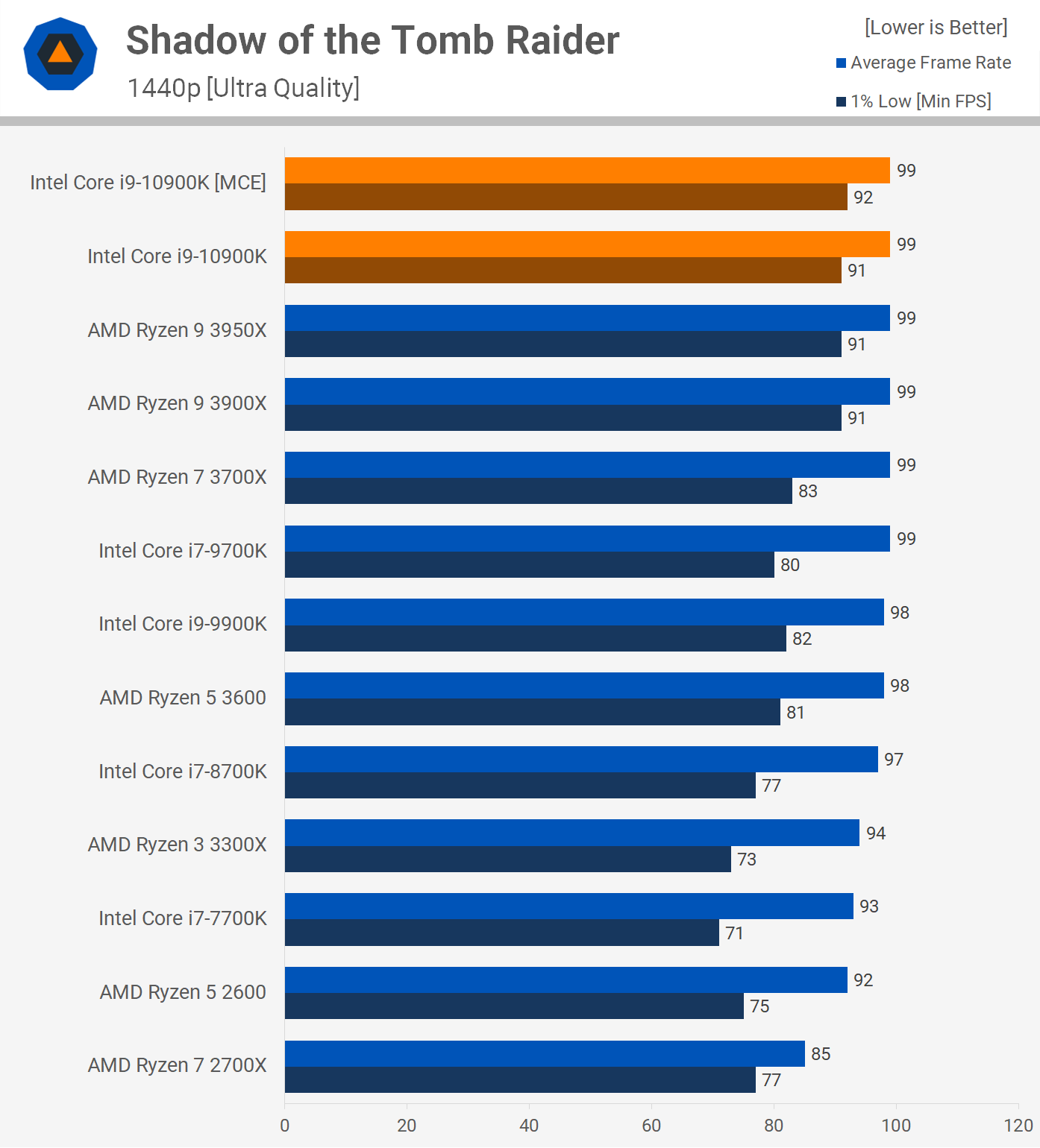 Le passage à 1440p voit les processeurs haut de gamme un goulot d'étranglement GPU élevé et, par conséquent, les 3900X, 3950X et 10900K offrent tous les mêmes 99 fps en moyenne et 91 fps 1% bas.