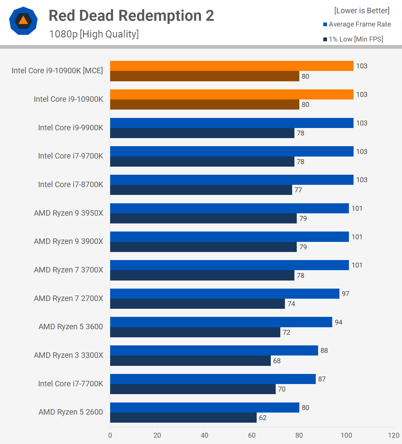 Enfin, nous avons Red Dead Redemption 2 avec des paramètres de qualité réduits et malgré cela, nous rencontrons toujours un goulot d'étranglement GPU solide avec les processeurs haut de gamme, limitant les performances à un peu plus de 100 ips en moyenne.
