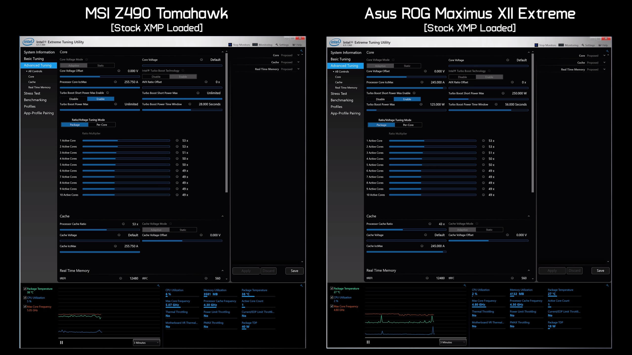 Lors des tests sur l'Asus ROG Maximus XII Extreme et le MCE activés, la carte a maintenu une fréquence d'horloge tous cœurs de 4,9 GHz, mais avec le MCE désactivé, la fréquence a chuté jusqu'à 4,3 GHz. Intel annonce jusqu'à un turbo tout-cœur de 4,9 GHz en fonction de la charge de travail et de la durée, il semble donc qu'Asus adhère à cette spécification.