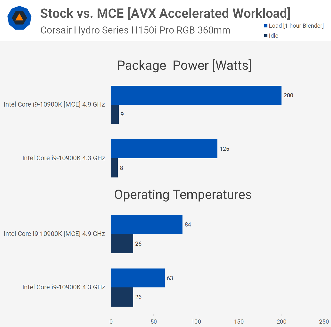 Les températures de fonctionnement ont été enregistrées lors de notre test de résistance du mélangeur, avec le Corsair Hydro H150i Pro installé. Stocker le Core i9-10900K a culminé à seulement 63c, ce qui est inférieur à ce que nous attendions, mais la consommation d'énergie est assez bonne, tout bien considéré, avec une puissance de 125 watts. L'optimisation de la tension et un processus de binning rigoureux sont à remercier ici car tous les 10 cœurs cadencés à 4,3 GHz ne nécessitent que 1,03 V.
