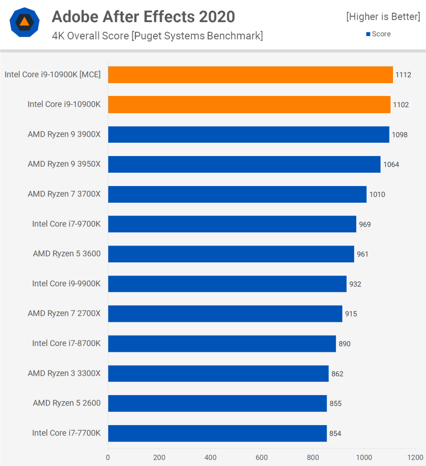 Le 10900K était également solide dans After Effects, égalant le 3900X, donc bien que ce ne soit pas une victoire pure et simple, il était tout aussi rapide.