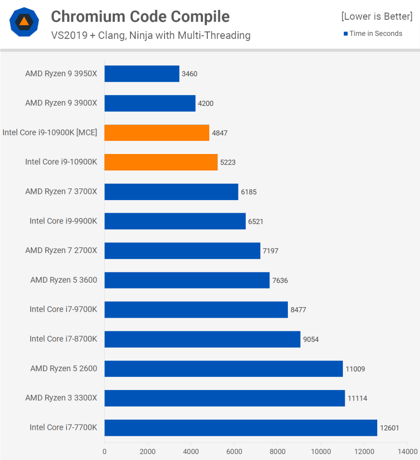 Voici un aperçu des performances de compilation de code et le 10900K se trouve à nouveau positionné entre le 3900X et le 3700X. Fondamentalement, il était 18% plus rapide que le 3700X mais toujours 20% plus lent que le 3900X et cela semble être le 10900K en bref en termes de performances de productivité.