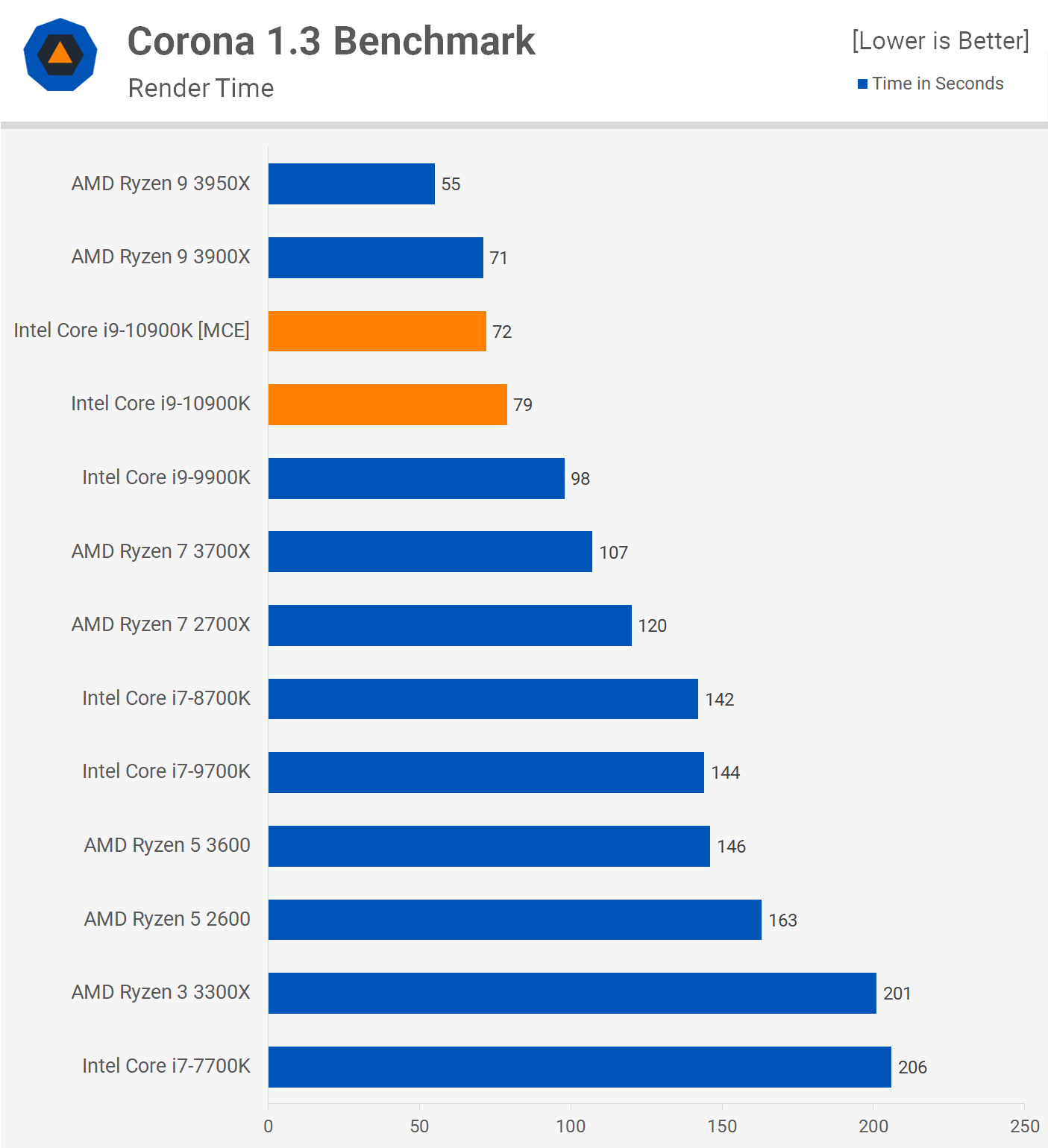 Le 10900K fait assez bien dans le benchmark Corona et avec MCE activé, il était en mesure de correspondre au 3900X, donc il y a cela. Le stock était 10% plus lent.