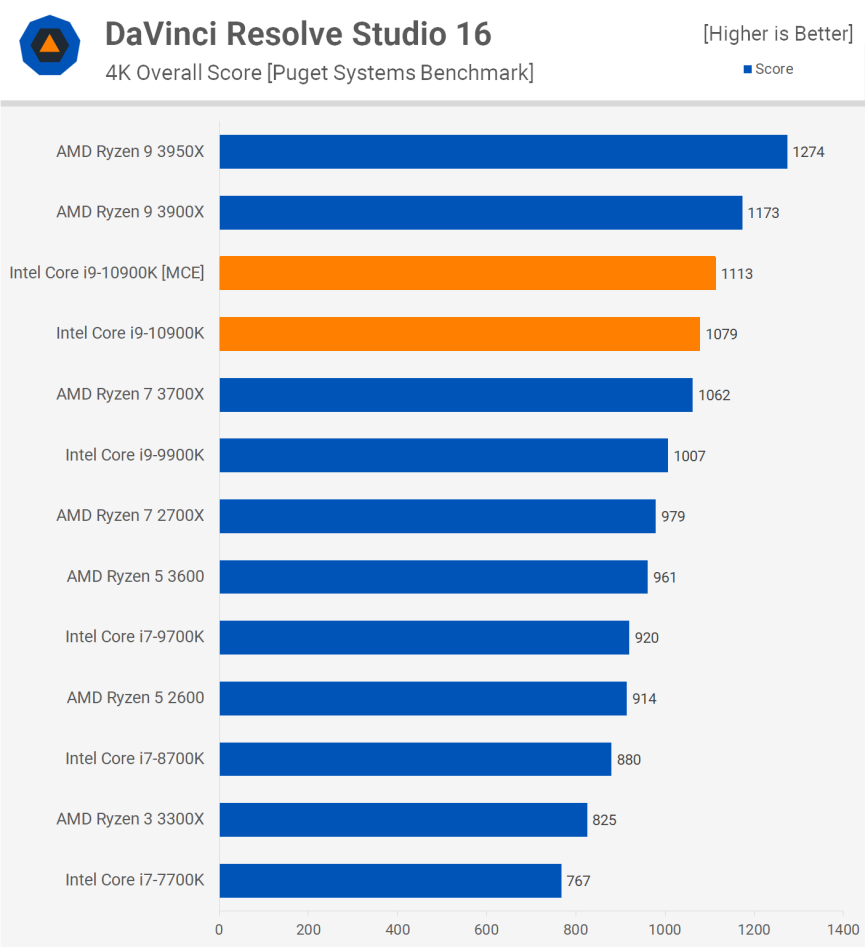 En passant aux performances de montage vidéo avec DaVinci Resolve Studio 16, nous voyons ici que le 10900K est à peine capable de surpasser le Ryzen 7 3700X, augmentant les performances de 1,5%. Cela signifiait que le 3900X était 9% plus rapide, pas une énorme marge, mais le processeur Ryzen légèrement plus abordable était plus rapide dans ce test.