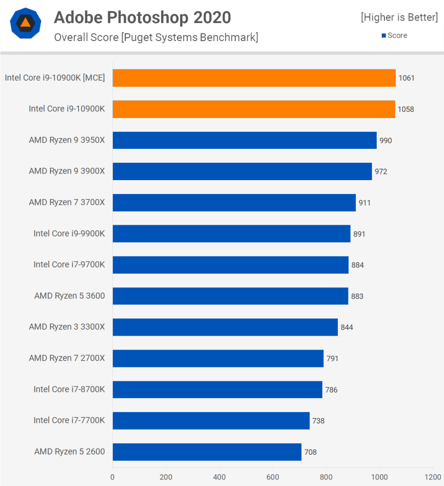 Photoshop bénéficie de solides performances monocœur et, par conséquent, le 10900K s'est très bien comporté, battant même le 3950X d'une marge de 7%. Donc, si vous recherchez les dernières performances de Photoshop, le 10900K est le chemin à parcourir.