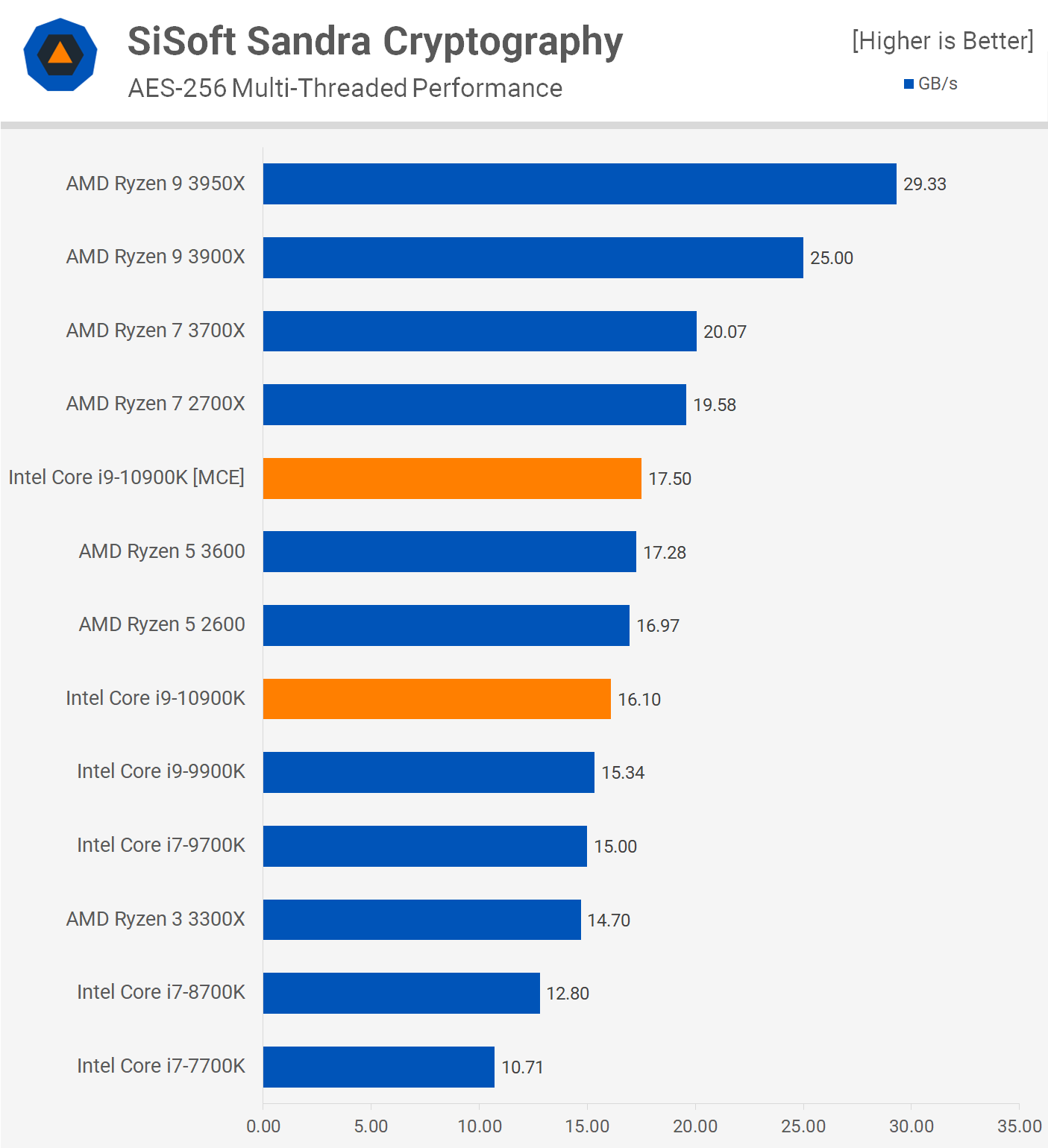 Les processeurs Ryzen dominent encore largement les performances de chiffrement AES et la référence SiSoft Sandra est l'un des tests les plus équilibrés. Malgré cela, le 3900X était 55% plus rapide que le 10900K.