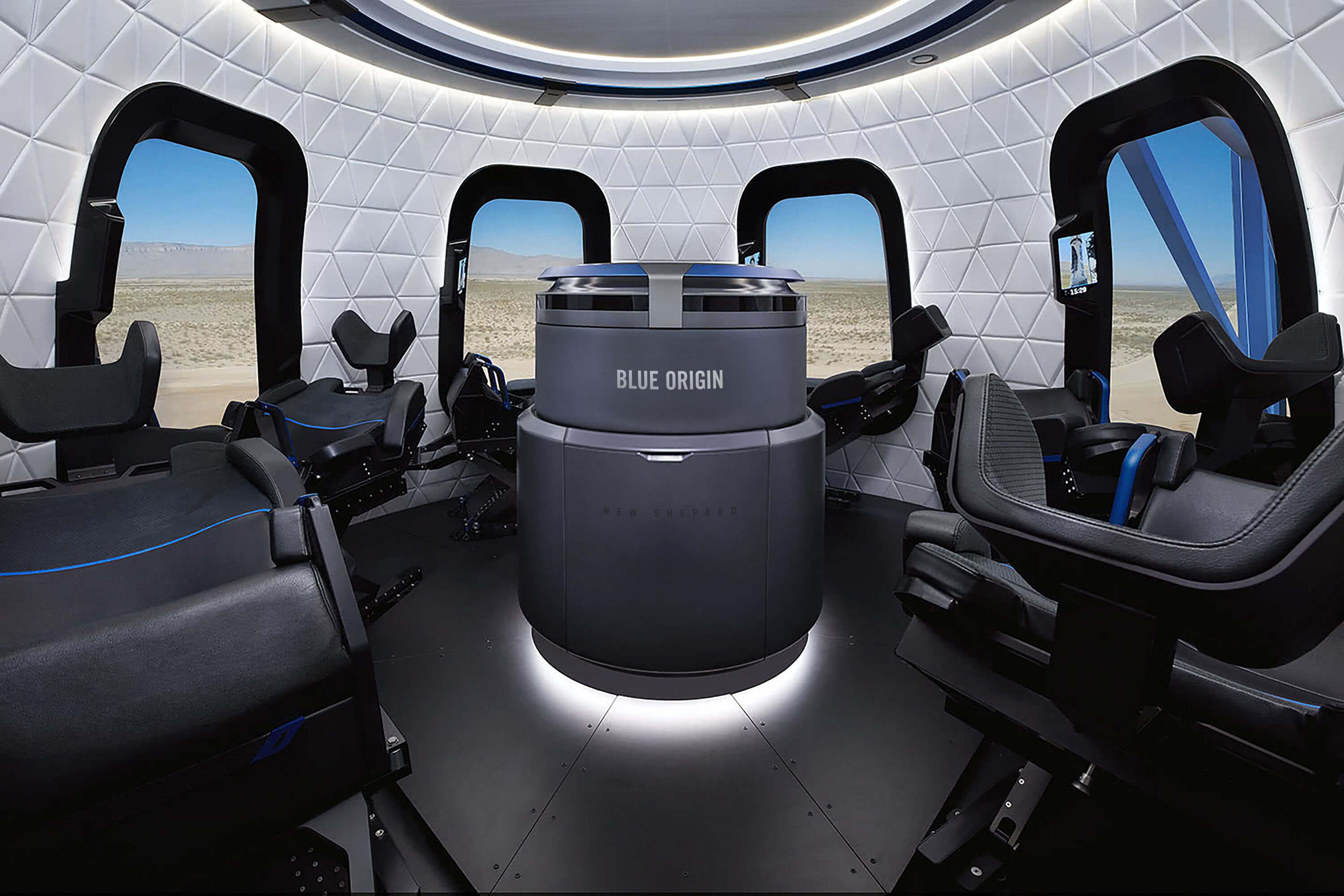 The above image shows how SpaceX envisions how the interior of the crew capsule of their Dragon craft might look like — the clinical nature and near total lack of instrumentation reflects the nature of how the craft functions and the nature of the crew, i.e. they're not required to fly it nor have any control over it. The same is true for Blue Origin's capsule (below):