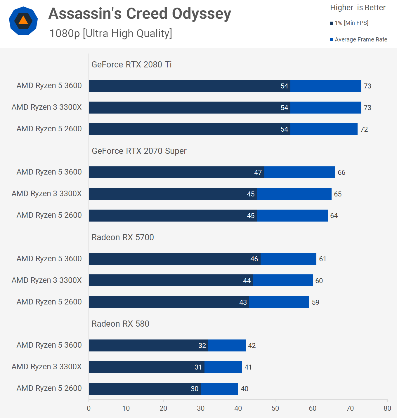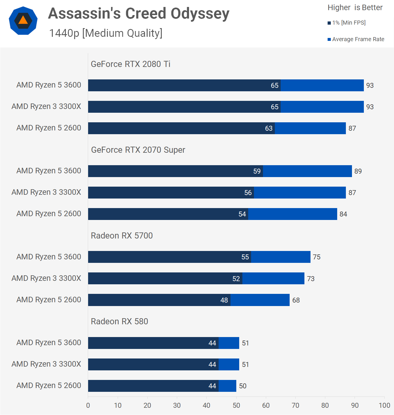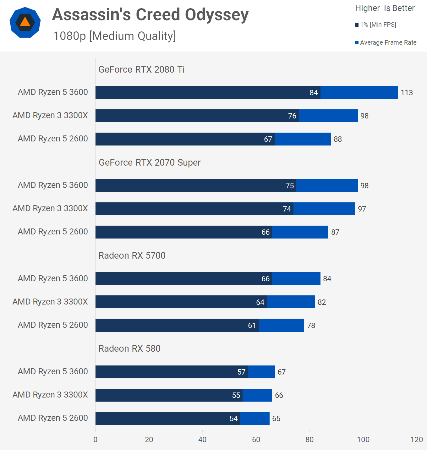 En commençant par Assassin’s Creed Odyssey en utilisant le préréglage de qualité moyenne à 1080p, nous constatons que le 3300X est positionné entre les 2600 et 3600 lorsque vous utilisez le RTX 2080 Ti, ce qui rend le R5 3600 environ 15% plus rapide. Cependant, le passage au RTX 2070 Super élimine presque entièrement cette marge, maintenant le 3600 n'est plus qu'une seule image plus rapide. Le 3300X était toujours 11% plus rapide que le 2600, donc une petite avance décente sur la partie de 2e génération.