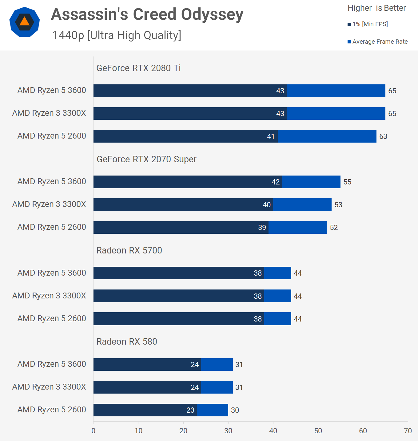 Enfin, nous avons les résultats Assassin’s Creed Odyssey en utilisant le ultra haut + 1440p. Pas de surprise ici, nous sommes presque entièrement liés au GPU et au sein de ce groupe de processeurs, il n'y a pas de différence dans les performances de jeu. Si vous prévoyez de jouer à ce jeu et à d'autres jeux similaires avec des paramètres de qualité maximale, vous constaterez principalement que le système est lié aux performances du GPU.