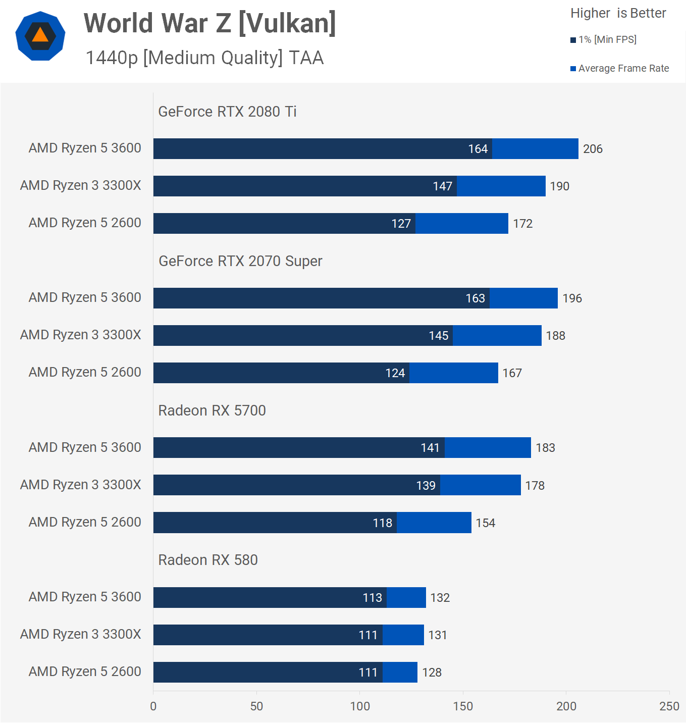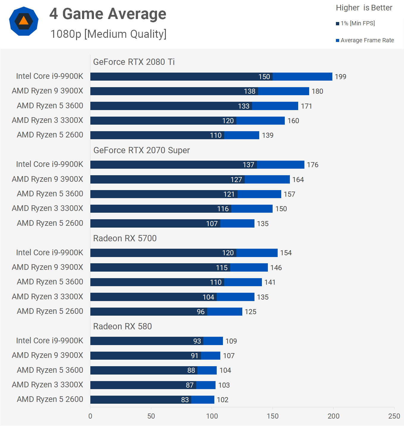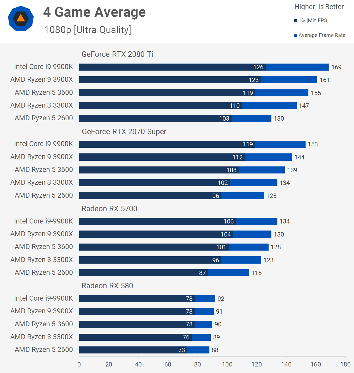 Fait intéressant, en utilisant la Radeon RX 5700, la fréquence d'images moyenne du 3300X s'éloigne du 3600. Nous avons constaté dans le passé que les pilotes AMD produisent plus de surcharge, alors c'est peut-être ce que nous voyons ici. Au moment où nous passons au RX 580, les choses commencent à se mettre en place, mais même ici, nous voyons toujours que la latence accrue de l'architecture Zen + est un peu un problème pour le 2600.