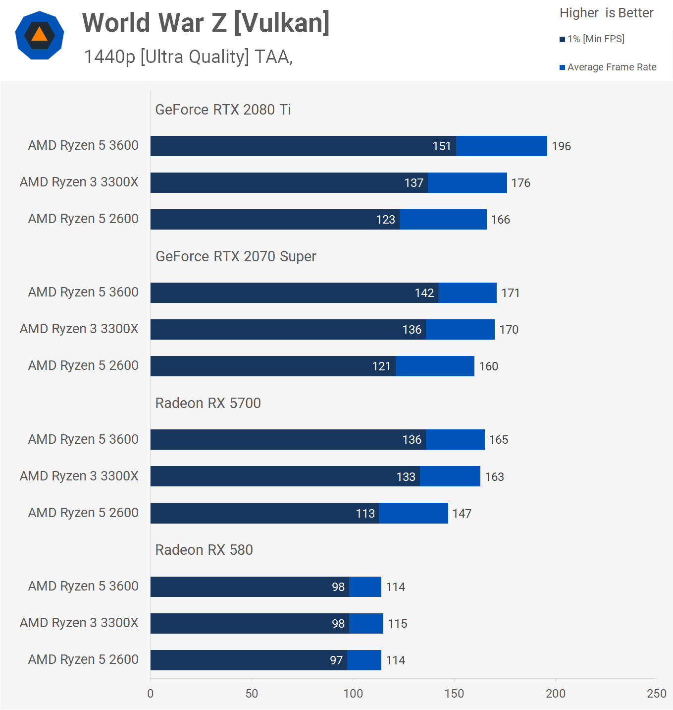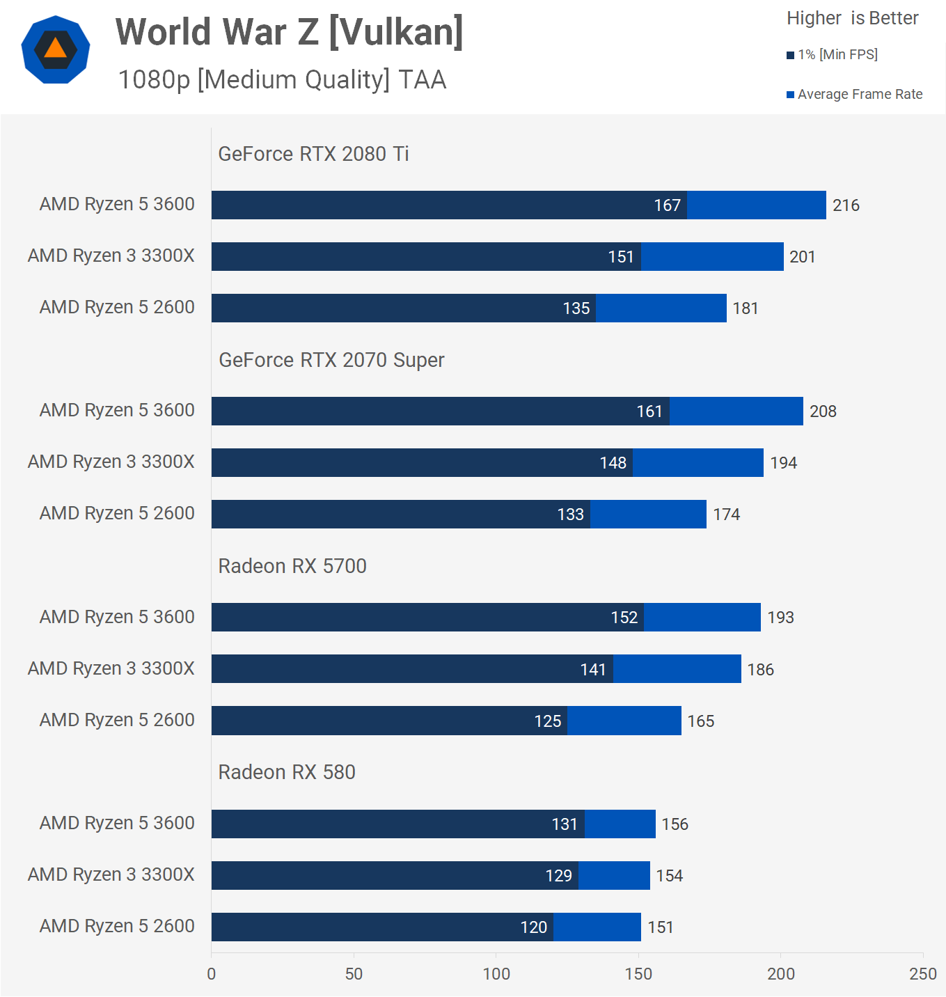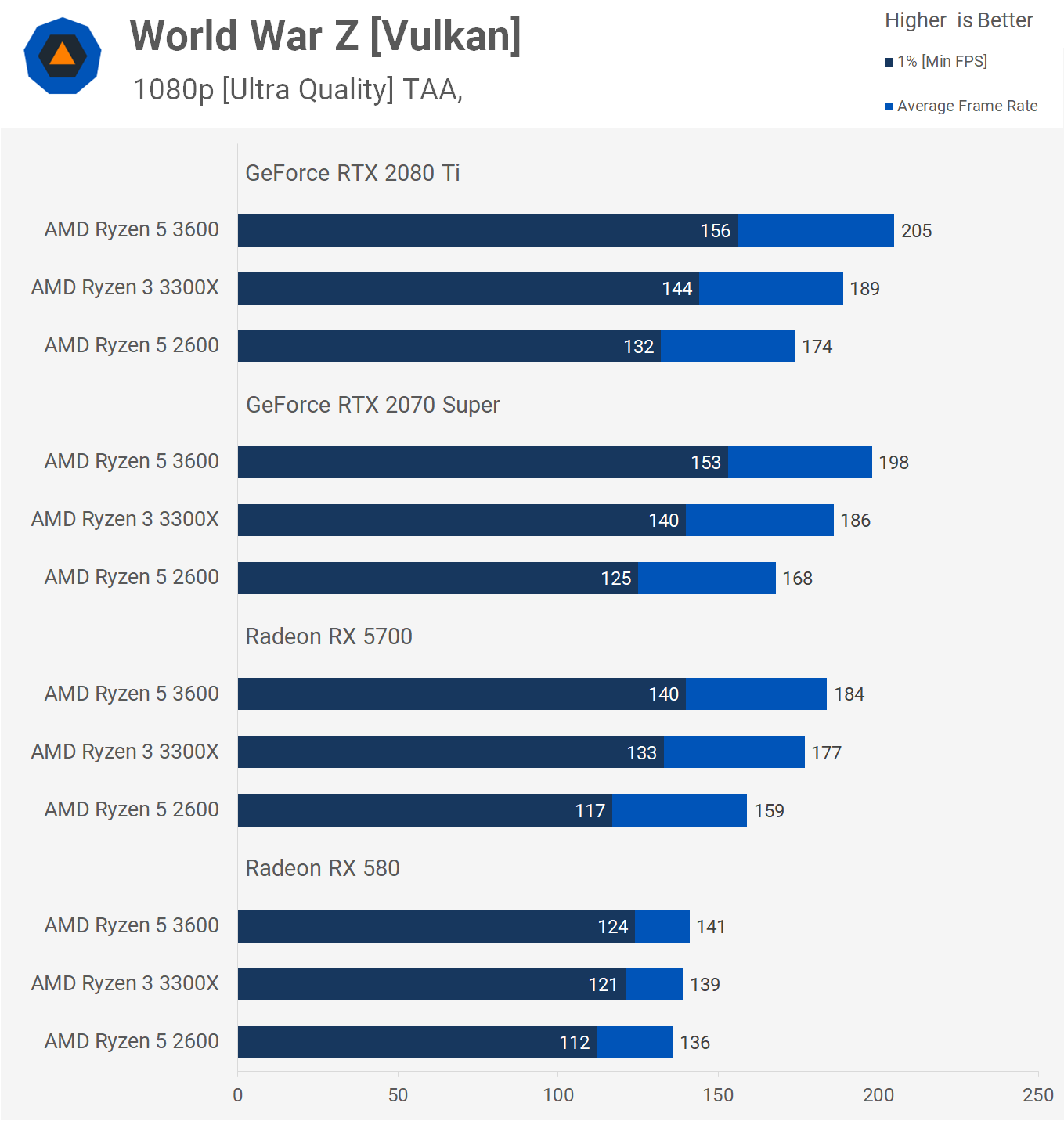 Fait intéressant, en utilisant la Radeon RX 5700, la fréquence d'images moyenne du 3300X s'éloigne du 3600. Nous avons constaté dans le passé que les pilotes AMD produisent plus de surcharge, alors c'est peut-être ce que nous voyons ici. Au moment où nous passons au RX 580, les choses commencent à se mettre en place, mais même ici, nous voyons toujours que la latence accrue de l'architecture Zen + est un peu un problème pour le 2600.