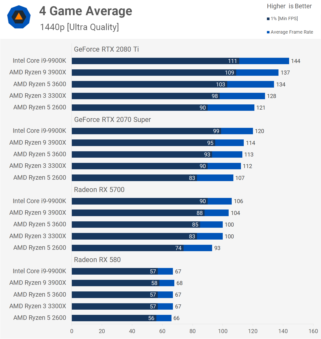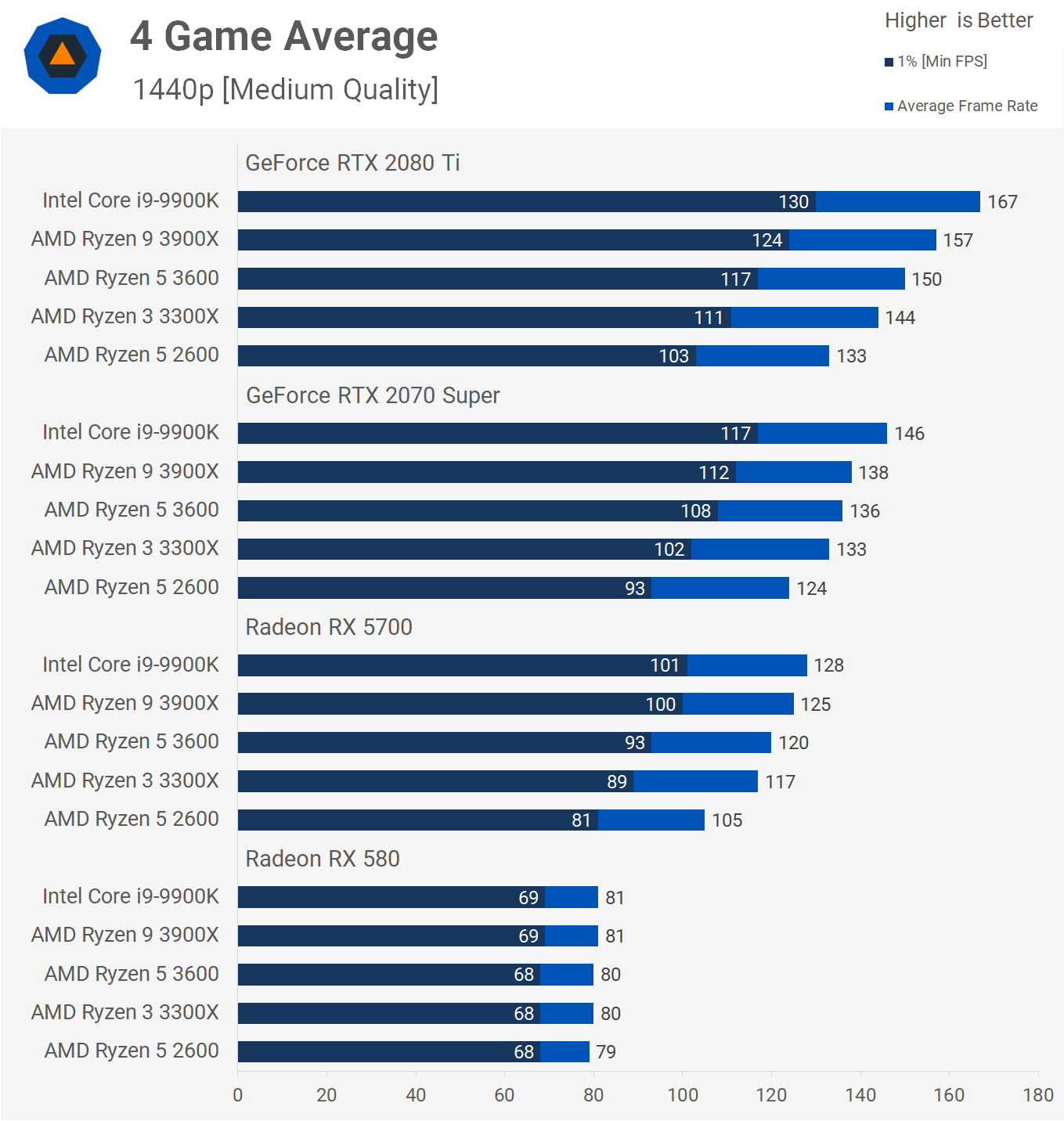 Si nous augmentons la résolution des jeux à 1440p tout en jouant sur des paramètres moyens, nous constatons que le 3600 est maintenant juste 5% plus rapide que le 3300X avec le RTX 2080 Ti. Des marges similaires sont observées avec le RTX 2070 Super et le RX 5700.