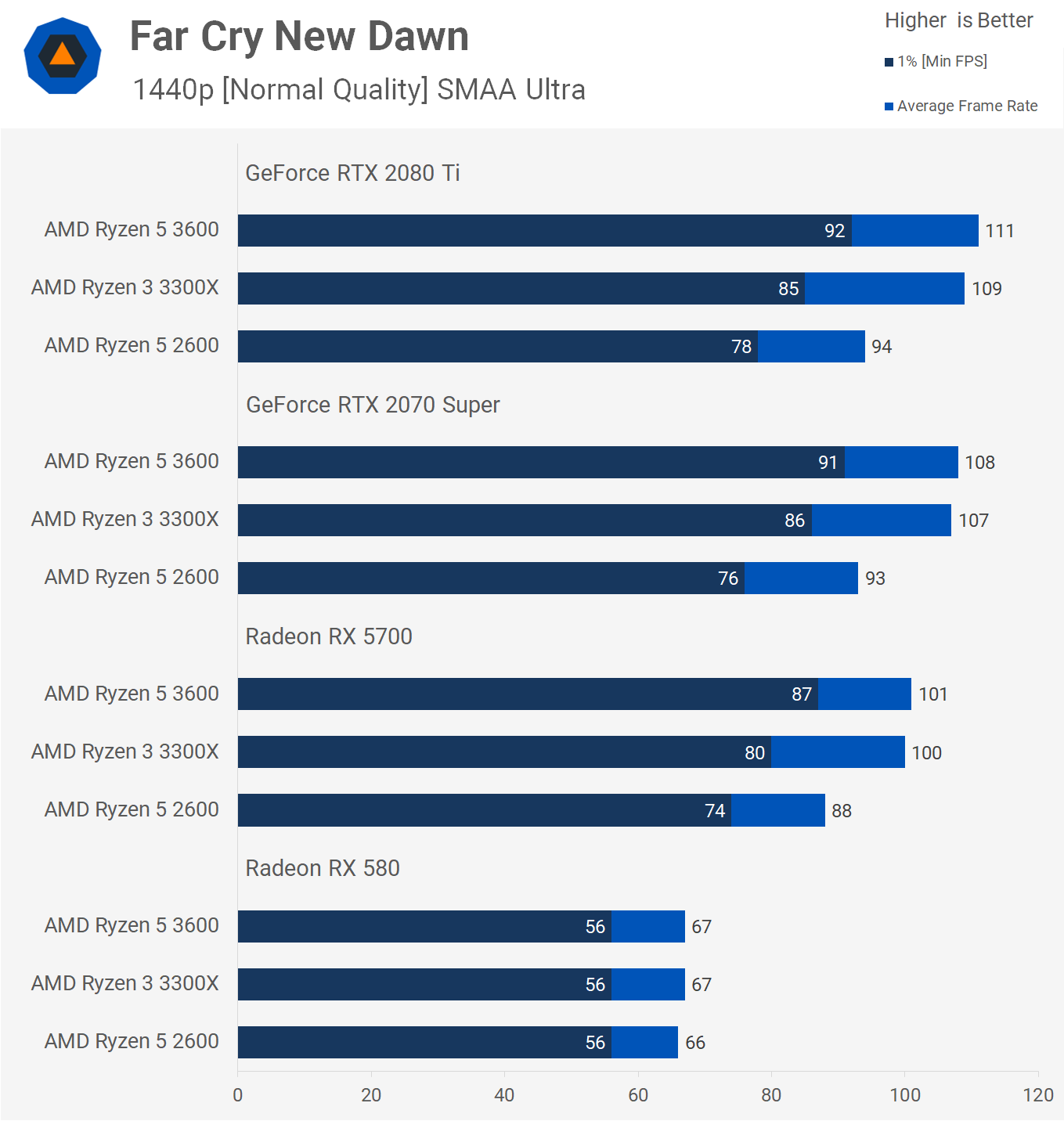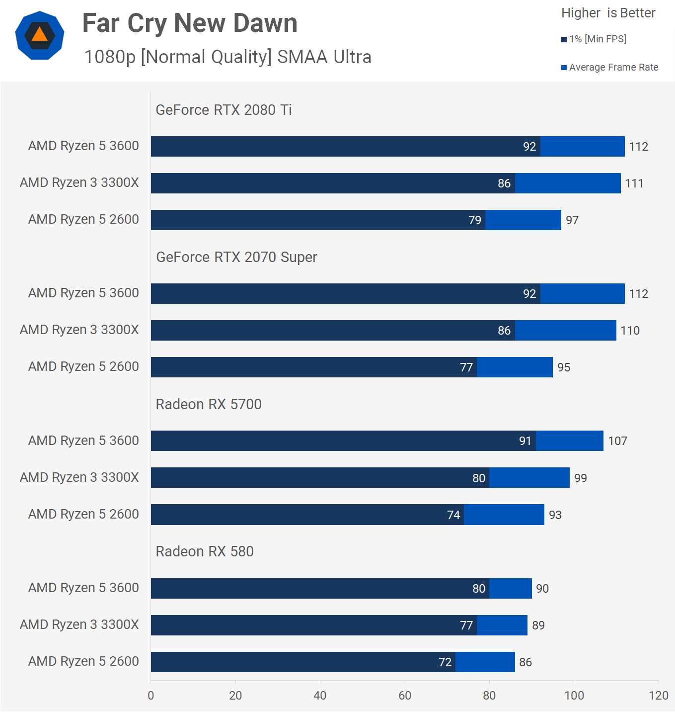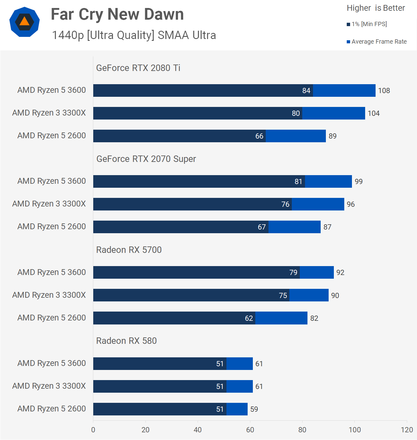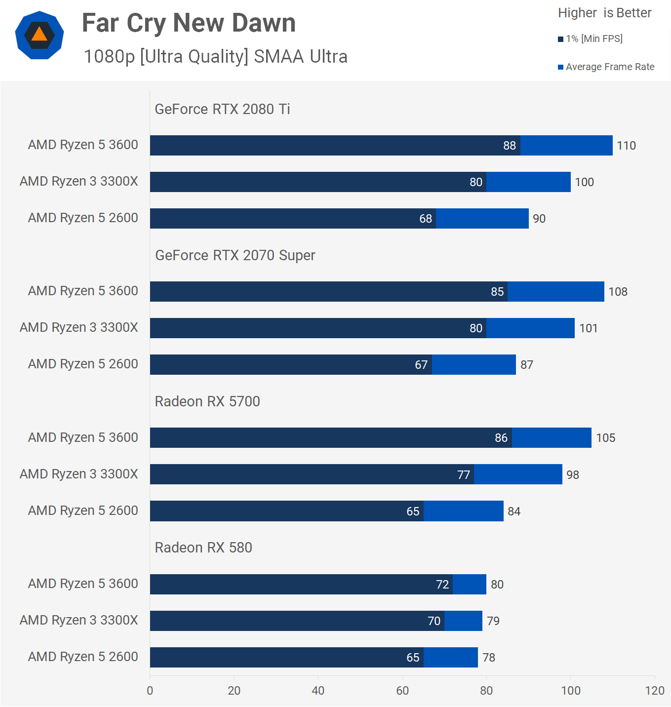 Nous trouvons des résultats Far Cry New Dawn plus intéressants à 1080p lorsque nous augmentons la qualité prédéfinie à «Ultra». Cela semble augmenter la charge du processeur et le 3300X est maintenant jusqu'à 10% plus lent que le 3600 lors de la comparaison des fréquences d'images moyennes.