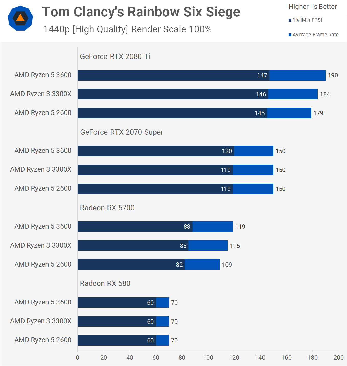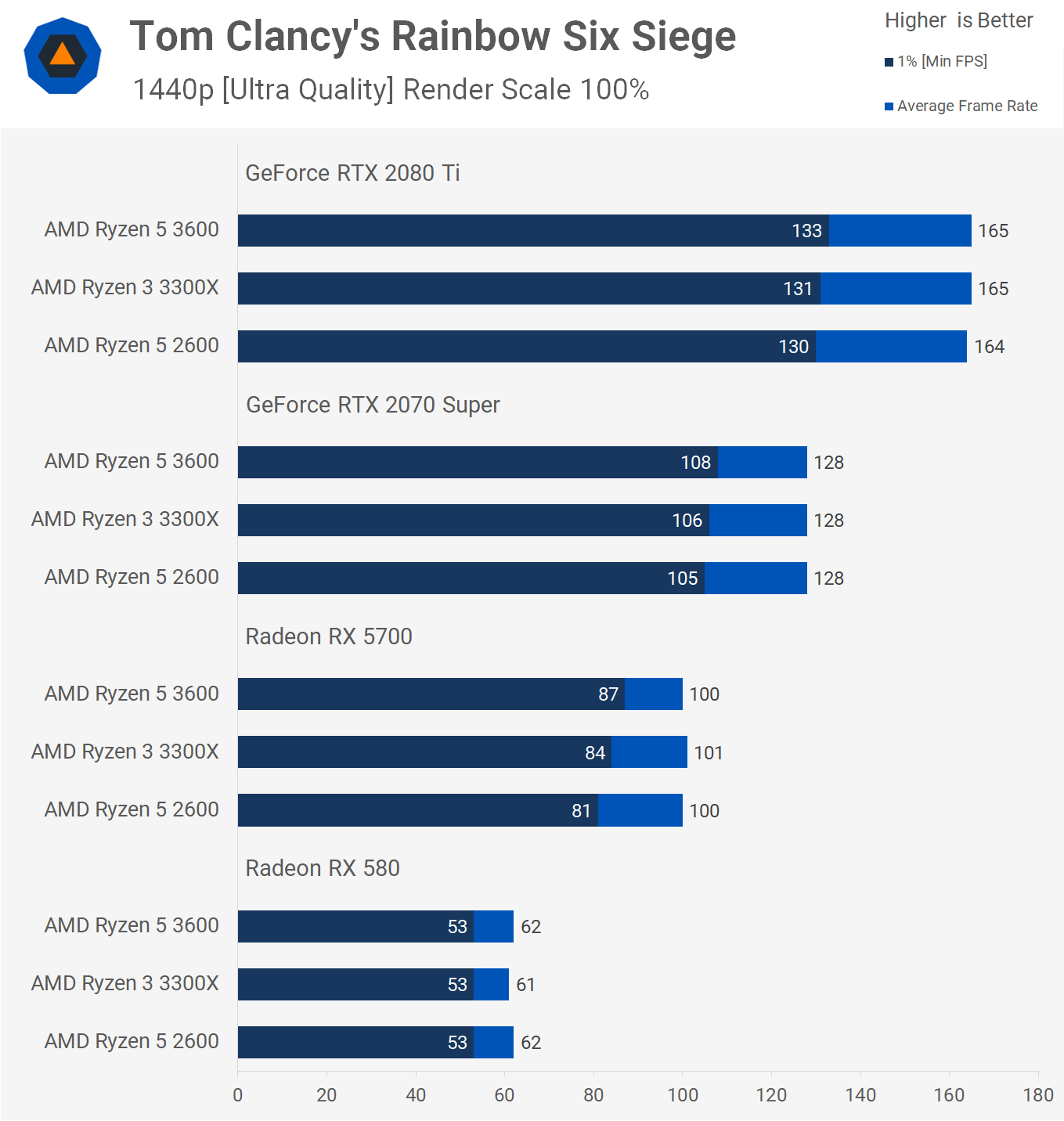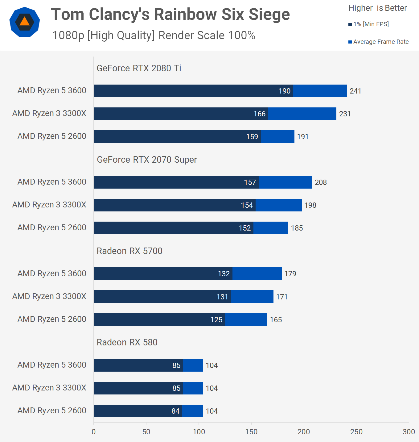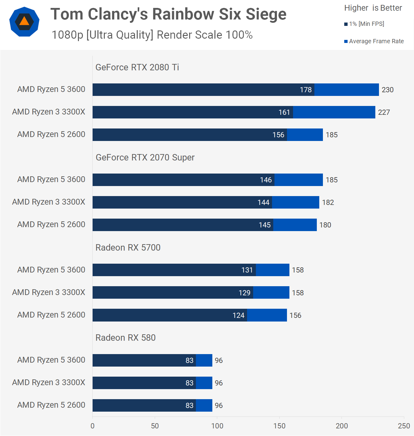 En testant avec Rainbow Six Siege de Tom Clancy et des données de qualité moyenne 1080p (étiquetées comme «hautes» dans ce jeu), nous avons des données plus intéressantes. Avec le RTX 2080 Ti, le 3600 est à peine 4% plus rapide que le 3300X pour comparer les moyennes, mais 14% plus rapide pour comparer les plus bas de 1%. En conséquence, le 3600 voit une disparité de performances de 27% entre sa moyenne et 1%, tandis que le 3300X voit une disparité de près de 40%, ce qui suggère que le processeur à 6 cœurs offre une expérience de jeu plus homogène et plus cohérente.