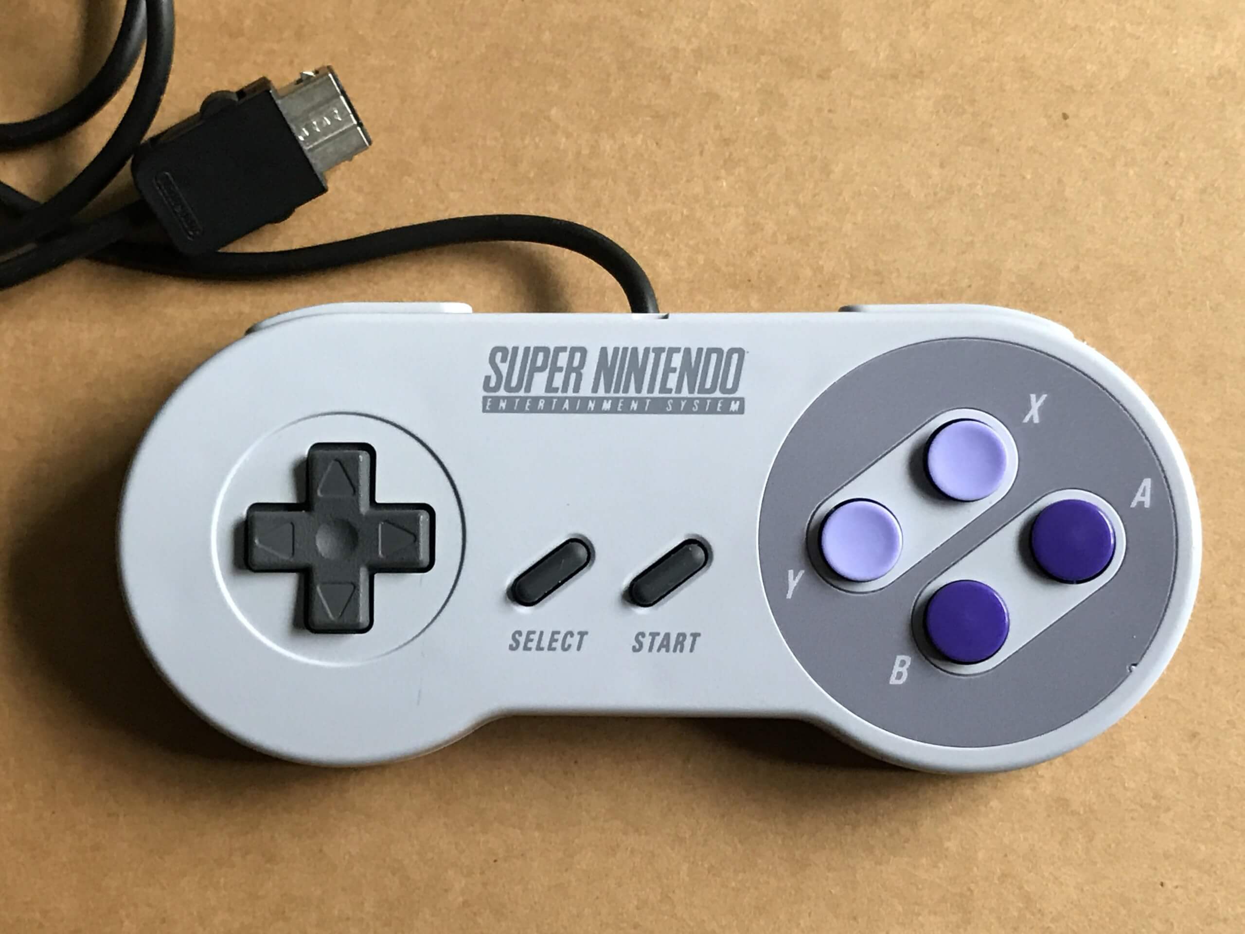 Le système de divertissement Super Nintendo (alias Super Nintendo. Alias ​​SNES) était le suivi de la NES en 1990. La SNES a amélioré la conception carrée de sa première manette de jeu en donnant à la nouvelle manette des bords arrondis et ergonomiques et en ajoutant quatre boutons supplémentaires: deux sur la face et des boutons sur les épaules gauche et droite.