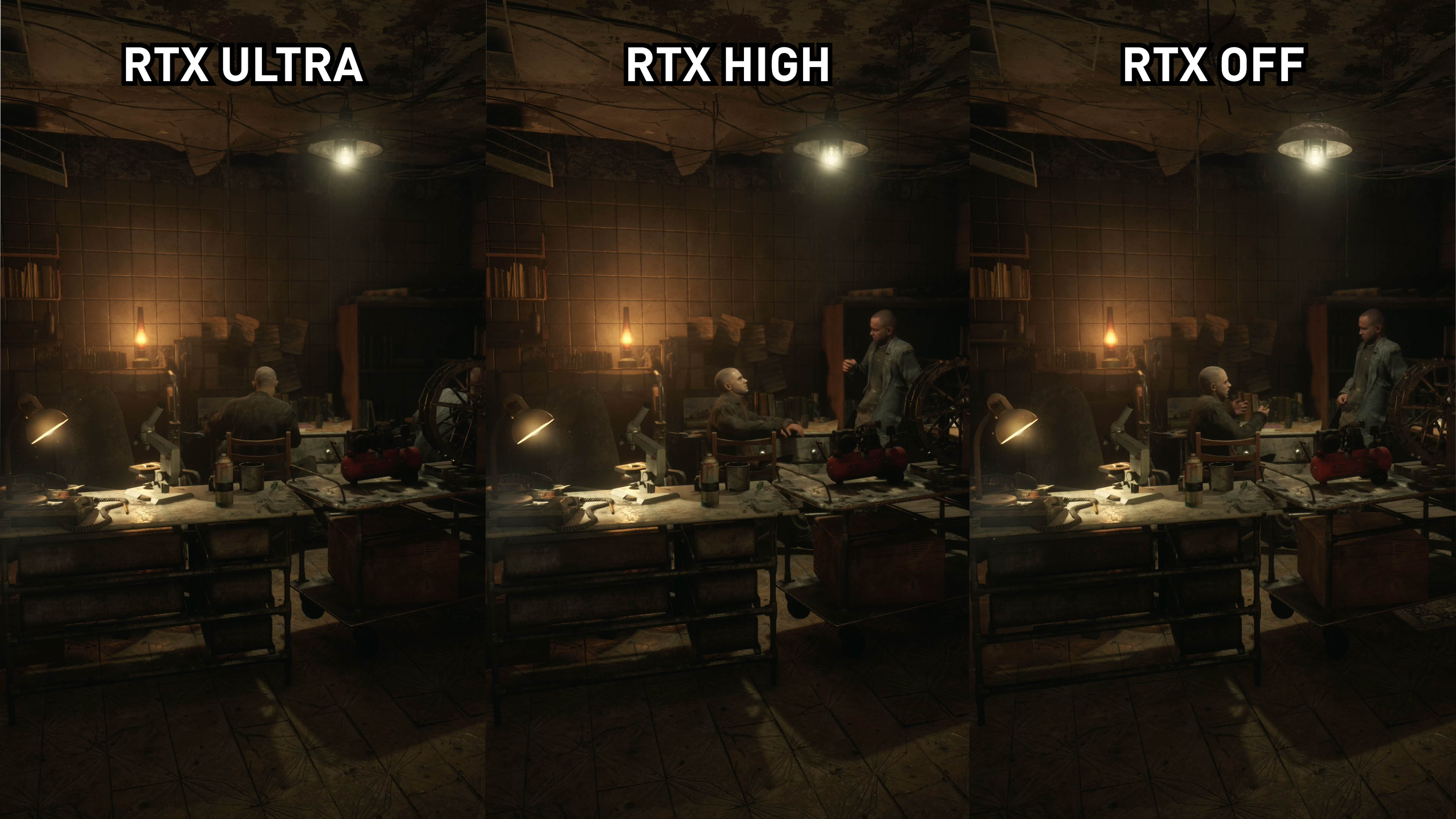 C'est une autre scène où il existe une différence significative entre l'activation et la désactivation de RTX. RTX off a l'impression d'avoir une lumière ambiante générale provenant d'une source inexistante. Tandis que le RTX sur métrage voit sa lumière provenir uniquement des fenêtres et des plafonniers, ce qui crée une présentation plus sombre mais plus naturelle.