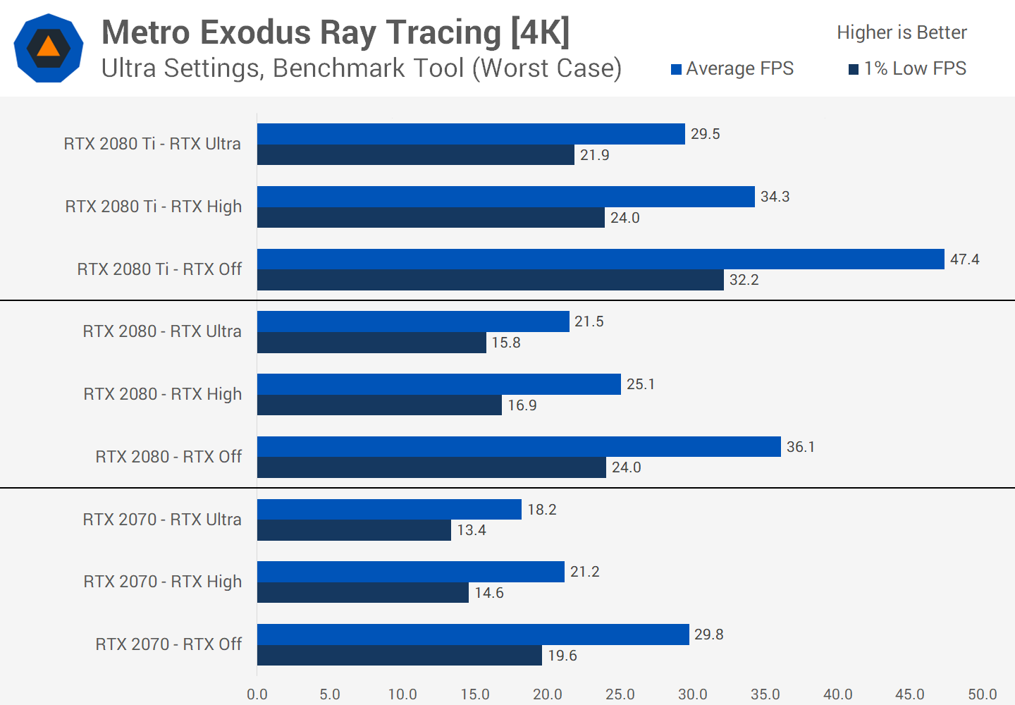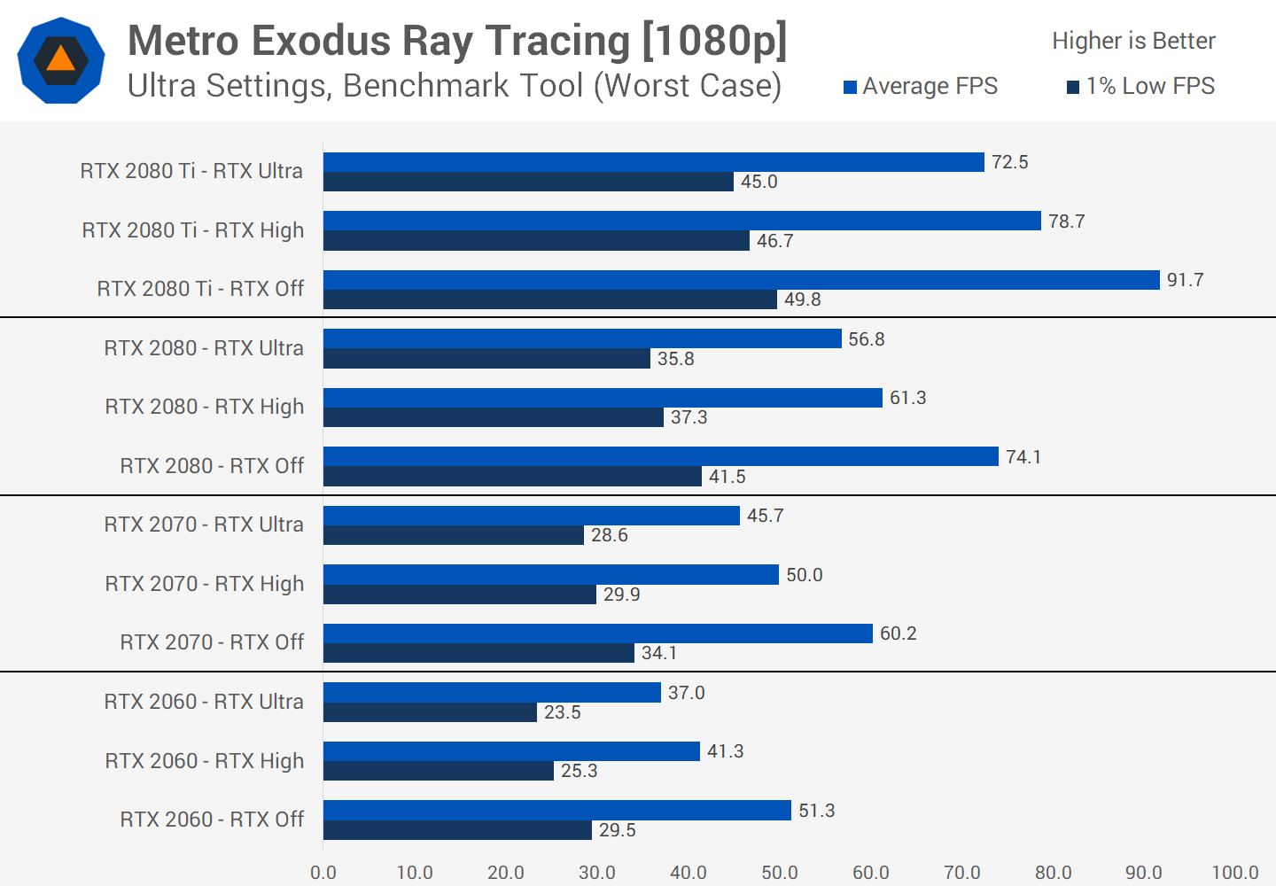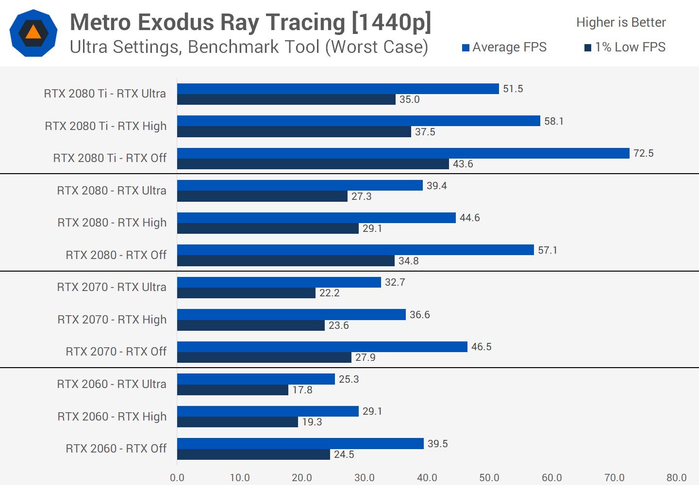 Avec Battlefield V, la performance obtenue en basculant les réflexions DXR du mode bas à désactivé a varié entre 50 et 60% pour la plupart des GPU à 1080p. Avec Metro Exodus, passer de Haut à Off est plus proche de 20%.
