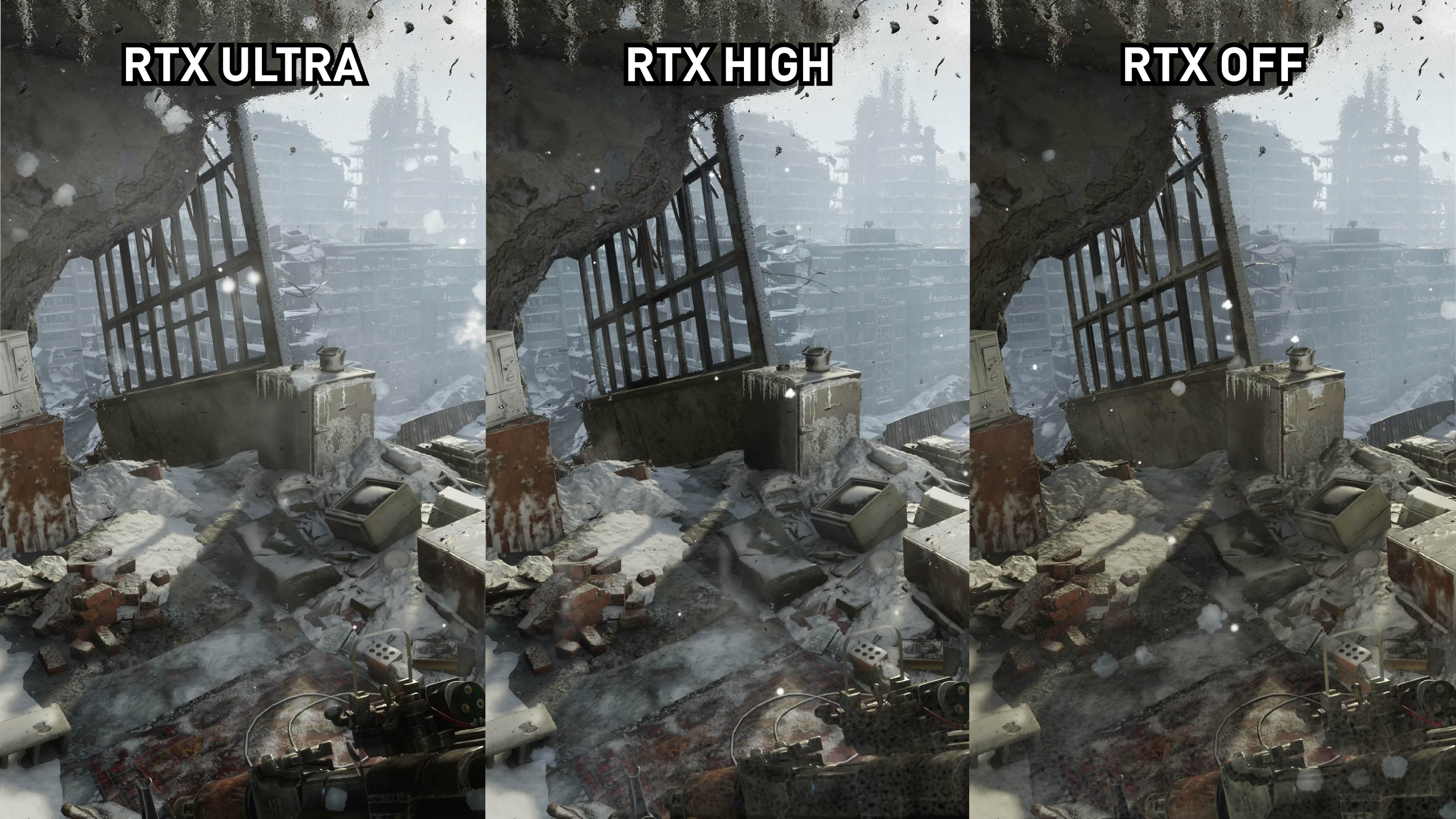 Une autre note intéressante à faire à propos de cette scène est le ton. L’environnement RTX off a une légère teinte jaune due à la couleur du soleil. Mais avec RTX éteint, il est plus blanc, grâce à la lumière réfléchie par les murs blancs et la neige. C’est l’un des autres avantages de l’éclairage global.