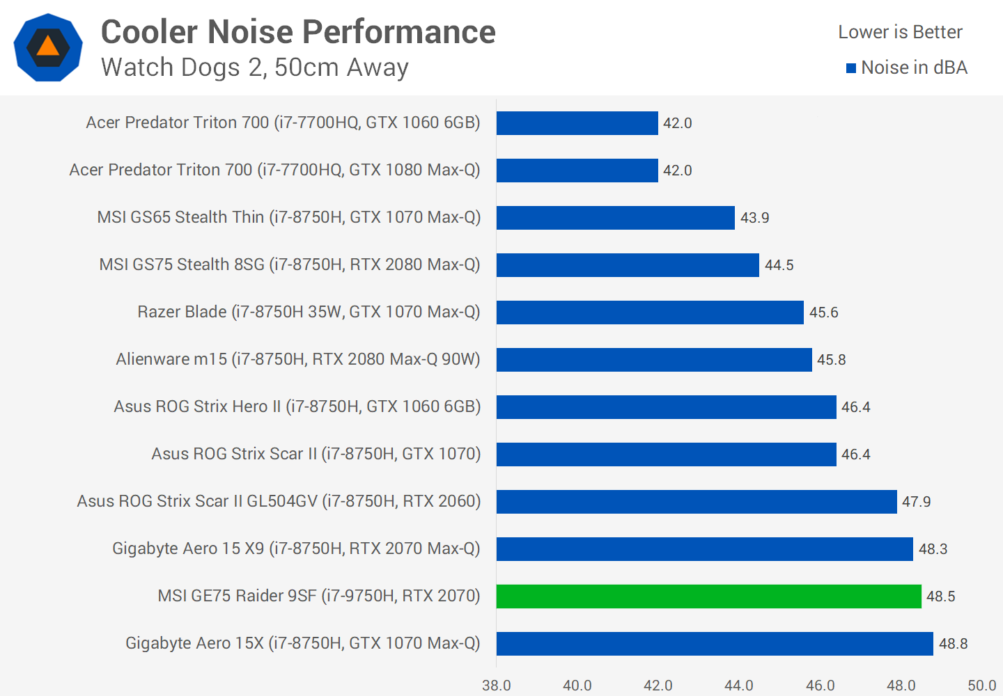 Avoir ce genre de marge de refroidissement est bon pour un certain nombre de raisons. Tout d’abord, le GE75 est assez bruyant lorsque le mode automatique est utilisé, jusqu’à 48 dBA. Mais avec le GPU ne tournant qu'à 75 degrés, vous pouvez réduire la vitesse du ventilateur en fonction des conditions ambiantes et obtenir une expérience plus agréable sans perte de performances. Ou vous pourriez faire un peu d'overclocking. Cela indique également que la variante RTX 2080 peut fonctionner aux fréquences prévues sans limitation importante, bien que nous n’ayons pas encore testé ce modèle.