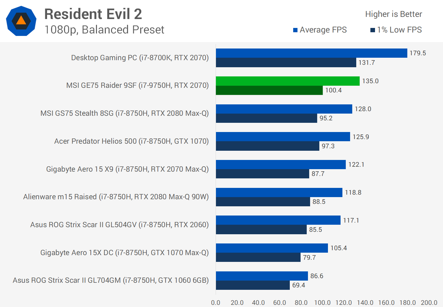 Une comparaison plus pertinente est la RTX 2070 par rapport à la GTX 1070. Les ordinateurs portables antérieurs dotés d'un châssis comme le GE75 étaient souvent chargés de la GTX 1070 et offraient des performances impressionnantes. Cependant, la RTX 2070 du GE75 est en moyenne 15% plus rapide que nos résultats globaux pour les ordinateurs portables GTX 1070 que nous avons testés précédemment. Même comparé à l'Acer Predator Helios 500, qui est l'un des ordinateurs portables les plus rapides de la GTX 1070 que j'ai testés, le GE75 est toujours 12% plus rapide avec un RTX 2070 à l'intérieur.