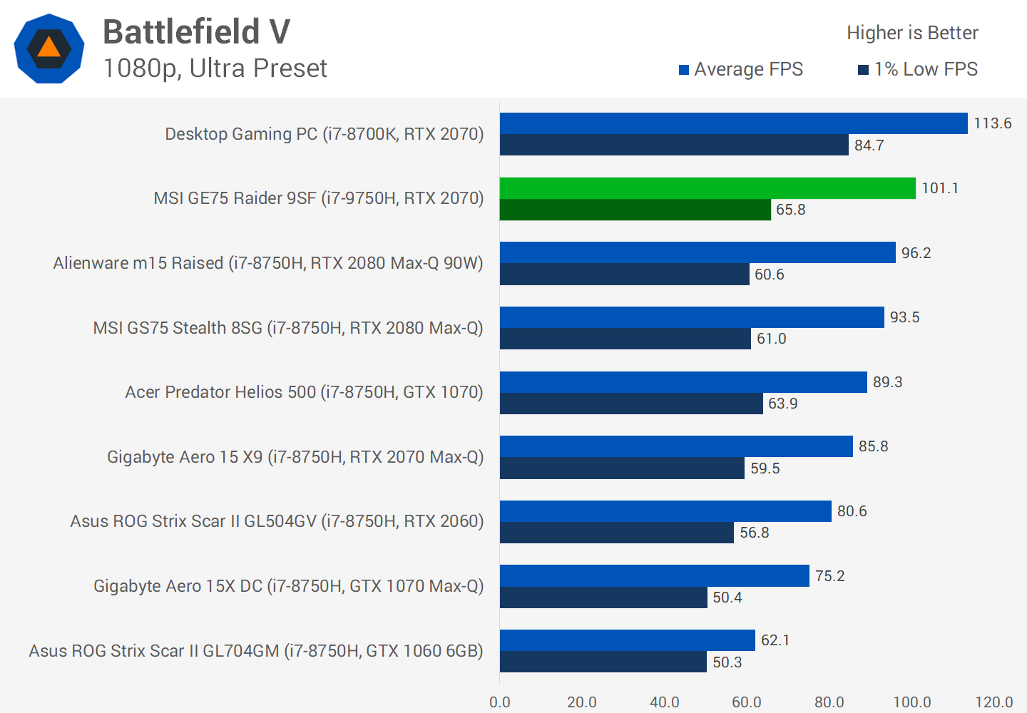 Dans Resident Evil 2, vous voyez plus de 130 images par seconde dans ce titre, ce qui en fait un ordinateur portable idéal pour les jeux à haute réactualisation. Dans Battlefield V, une moyenne de 100 FPS en 1080p montre à nouveau la puissance de ce système. Étant donné que le GE75 utilise un affichage à 144 Hz, le RTX 2070 tire pleinement parti de la marge supplémentaire de taux de rafraîchissement disponible.