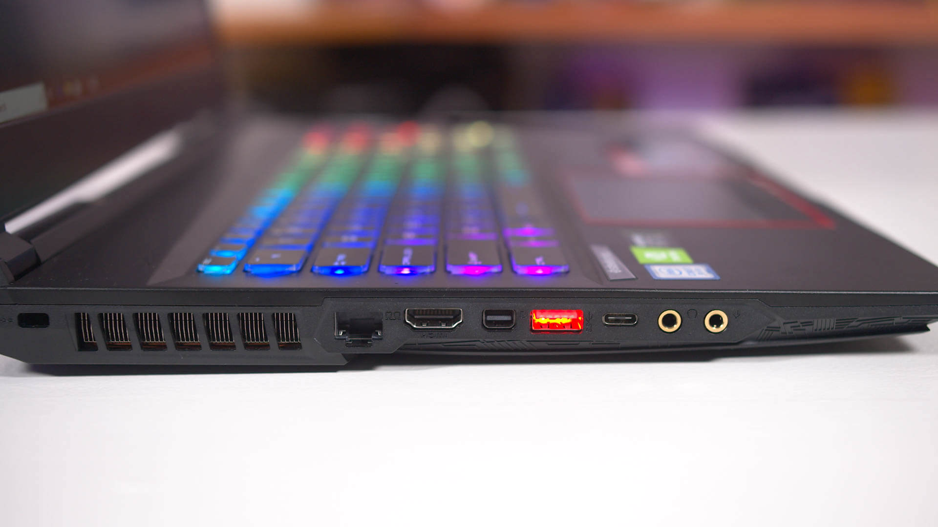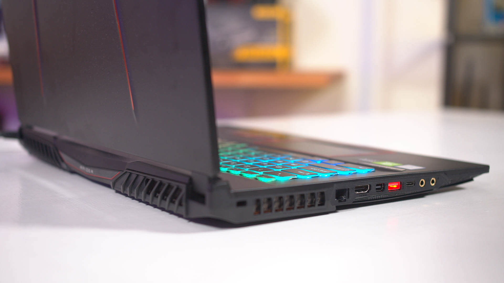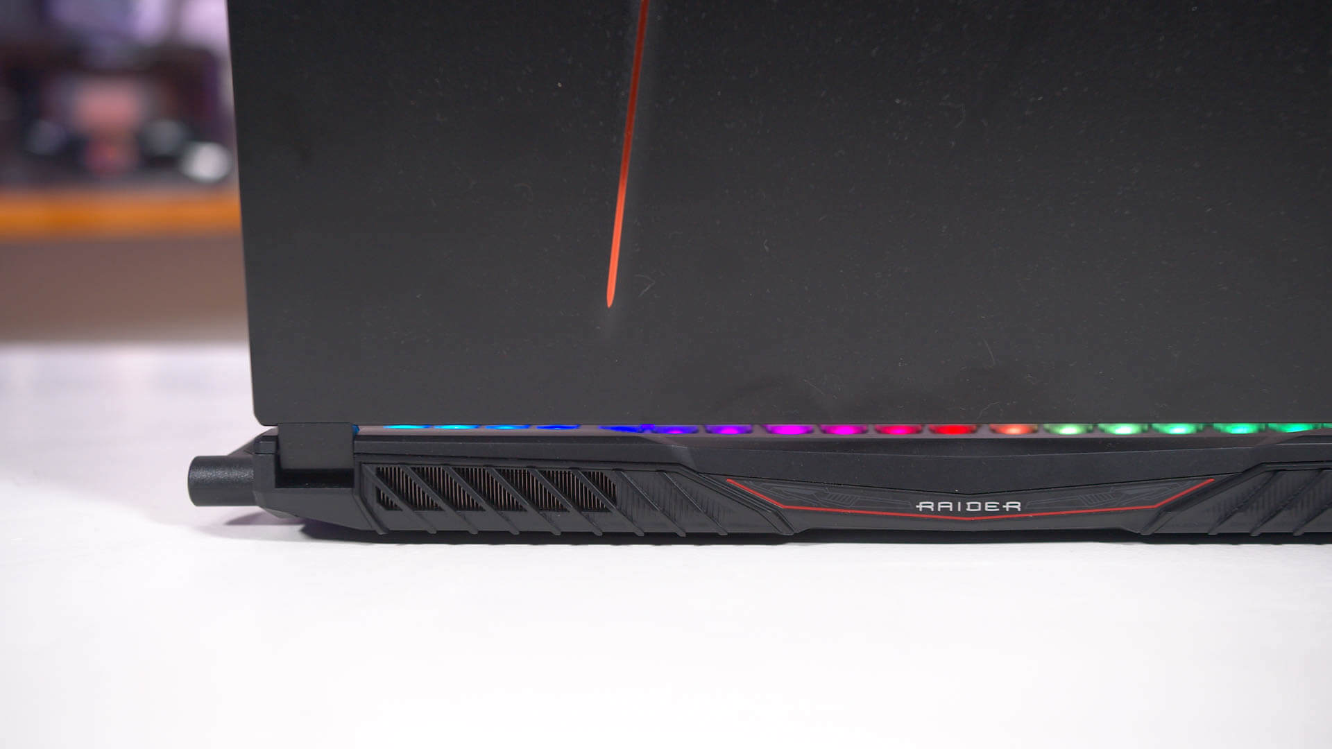 La sélection de ports correcte comprend trois ports USB de type A qui sont allumés en rouge, un port USB 3.2 Type-C de type 3.2, HDMI 2.0, Ethernet, deux prises audio, un mini-DisplayPort et un lecteur de carte SD. Tous les ports sont situés sur les côtés mais aucun ne bloque les orifices de ventilation, contrairement à certains autres modèles MSI, dans lesquels le câble d'alimentation peut facilement limiter le flux d'air sortant d'un évent latéral. De plus, il y a pas mal de bouches d'aération sur les bords de l'ordinateur portable pour maximiser le potentiel de refroidissement.
