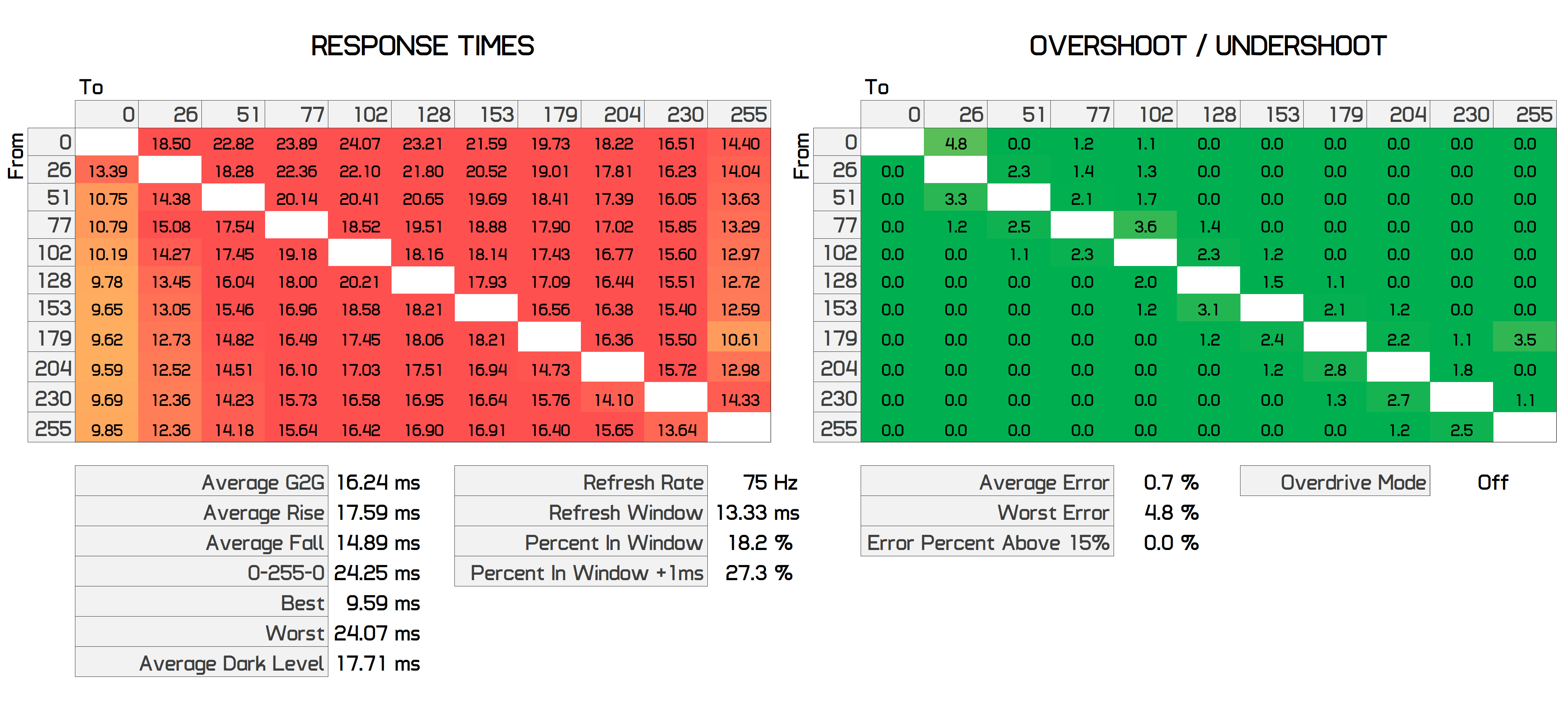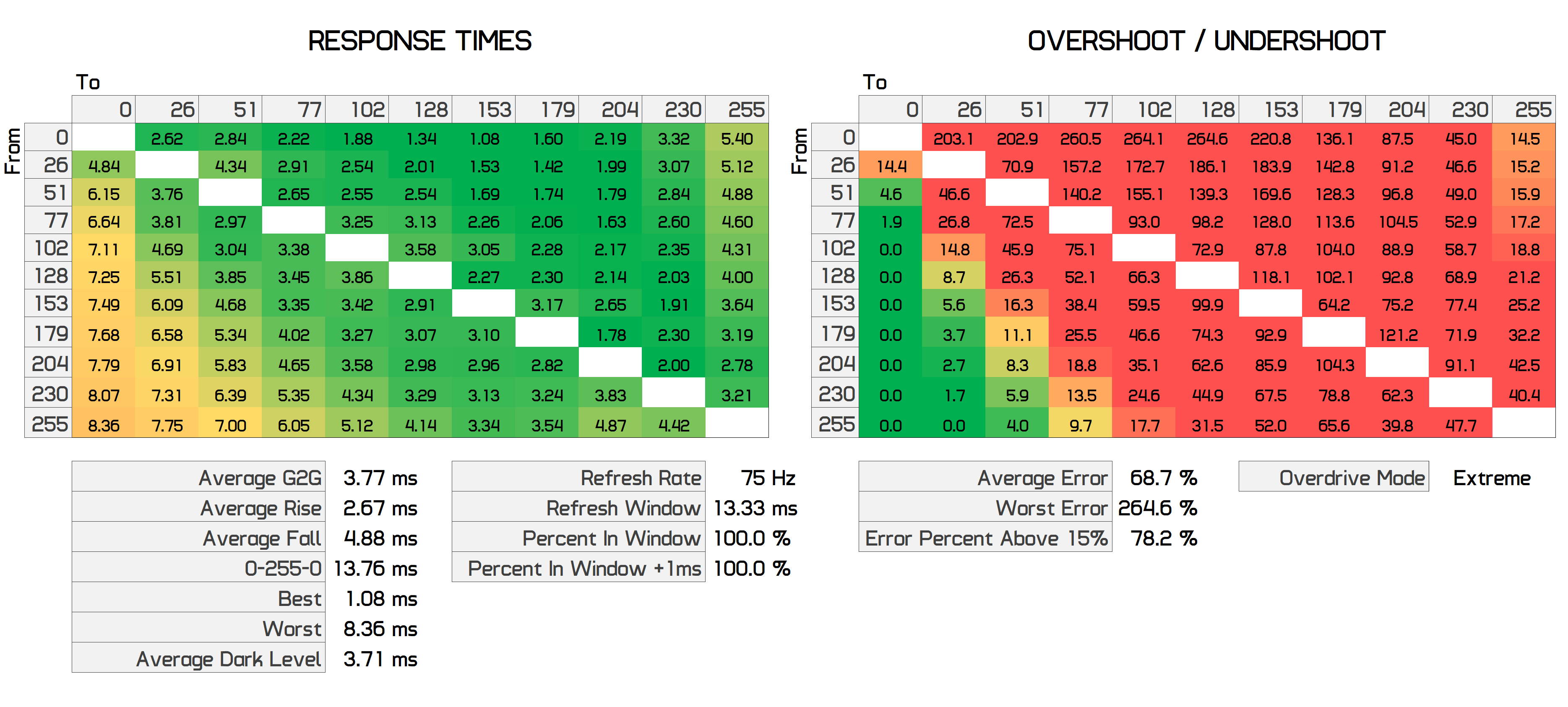 En parlant de modes d'overdrive … examinons les performances du temps de réponse. Il existe trois modes disponibles: Normal est le mode par défaut, il y a aussi Off et Extreme. La désactivation est très lente, nous sommes confrontés à une moyenne de gris à gris de 16,24 ms, ce qui est typique des panneaux IPS 1080p d'entrée de gamme sans overdrive. Les images fantômes sont importantes en utilisant ce mode, avec de longues traînées de traînée suivant des objets en mouvement. Seulement 27% des transitions se rapprochent de la longue fenêtre de rafraîchissement de 13,33 ms, donc ce mode n'est tout simplement pas assez rapide et ne serait pas génial à 60 Hz non plus.