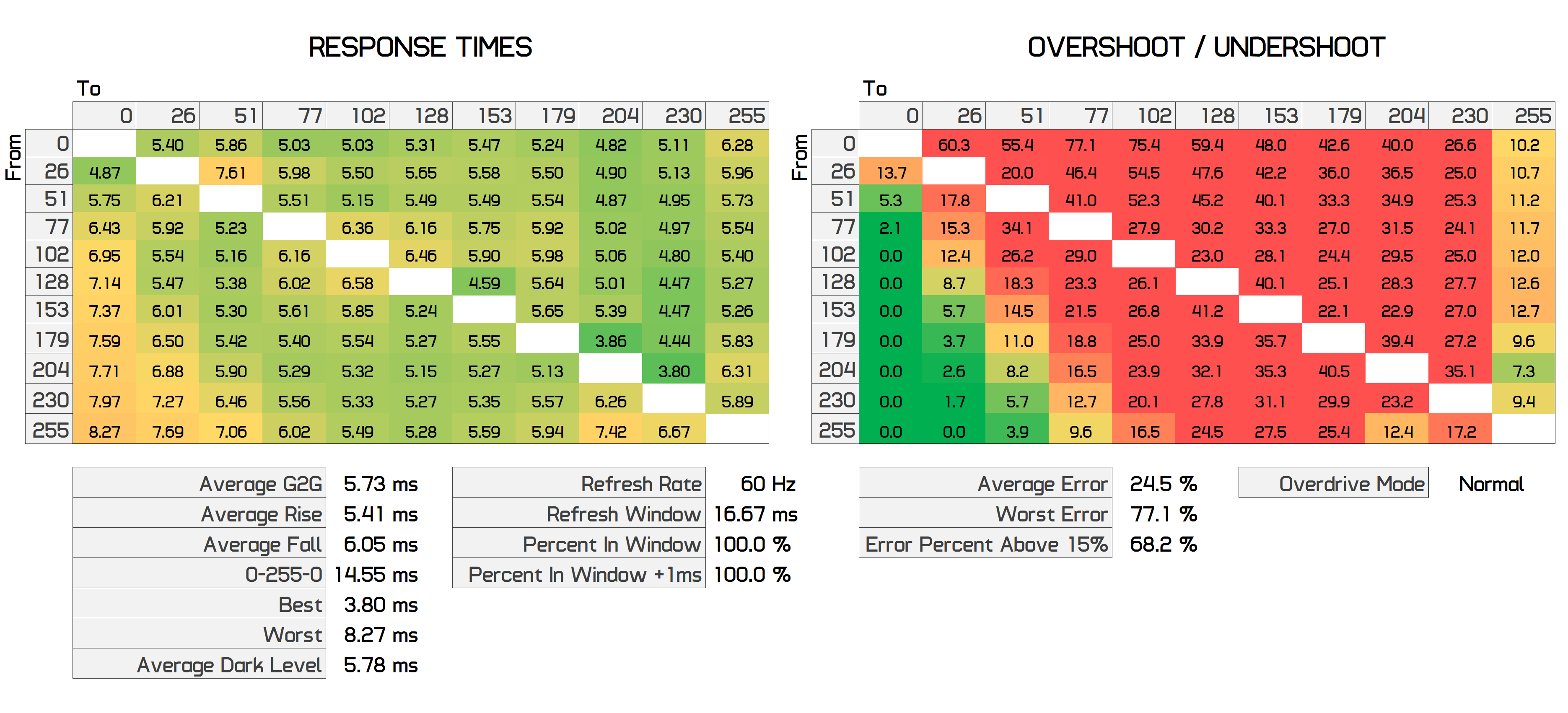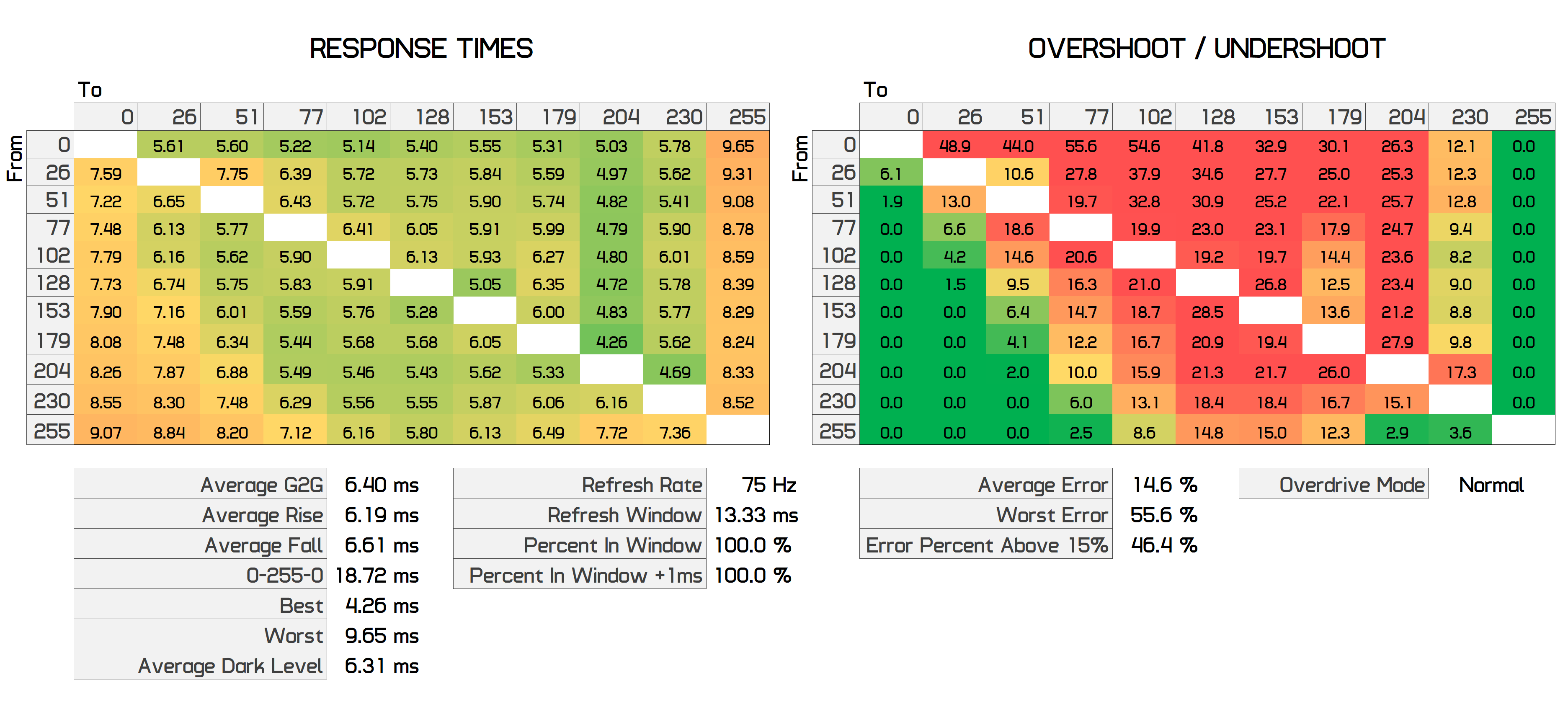 Normal prend les choses dans l'autre sens, nous avons maintenant une moyenne de gris à gris de 6,40 ms, ce qui est décent pour un moniteur IPS et permet au SB220Q d'atteindre une conformité de taux de rafraîchissement de 100%. Cependant, cela s'est fait au détriment du dépassement et d'une quantité assez importante de dépassement. Un taux d'erreur moyen de 14,6% est élevé et environ la moitié de toutes les transitions subissent des images fantômes inverses. De nombreuses transitions dépassent les 25% de dépassement, ce qui est notable.