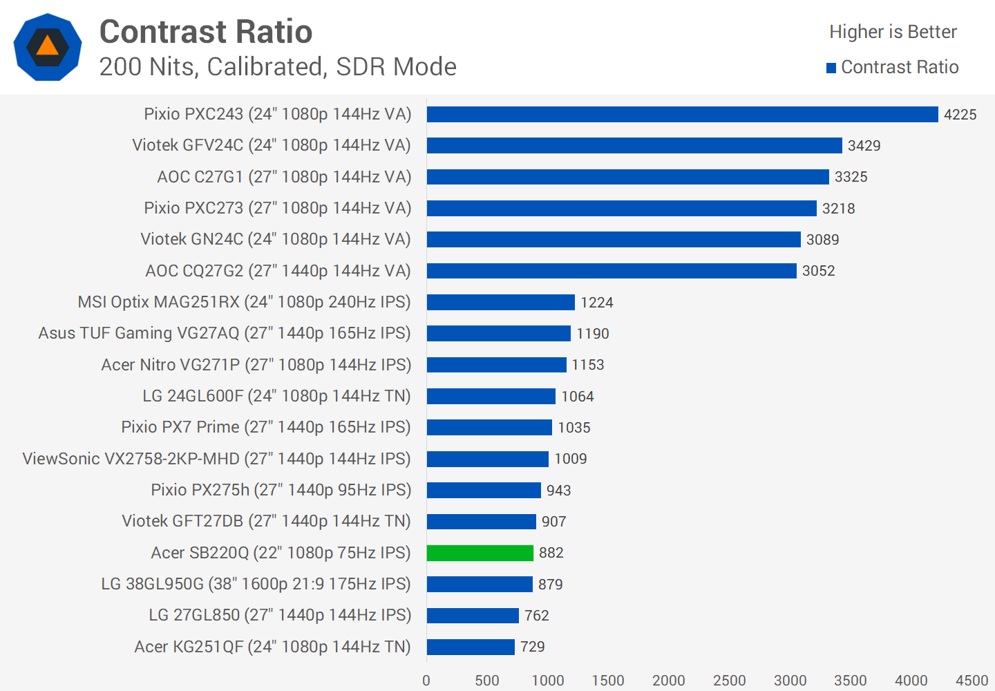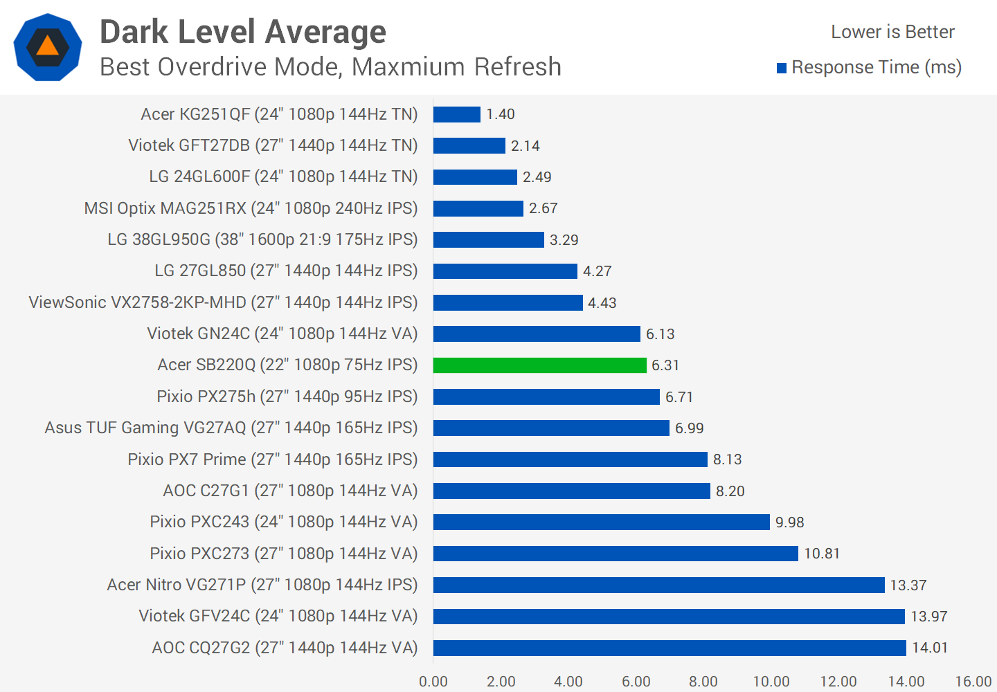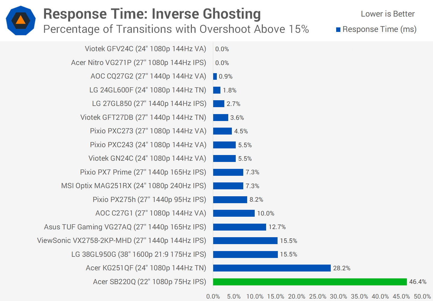 Passons en revue quelques options ici. Le Viotek GN24C est un panneau VA que nous avons assez souvent recommandé dans la catégorie budget, étant 1080p 144Hz, et il affiche une moyenne de 5 ms gris à gris avec 5% de fantômes inverses et des performances de niveau d'obscurité similaires. C'est une meilleure gestion des mouvements que ce que vous obtenez avec l'Acer SB220Q.