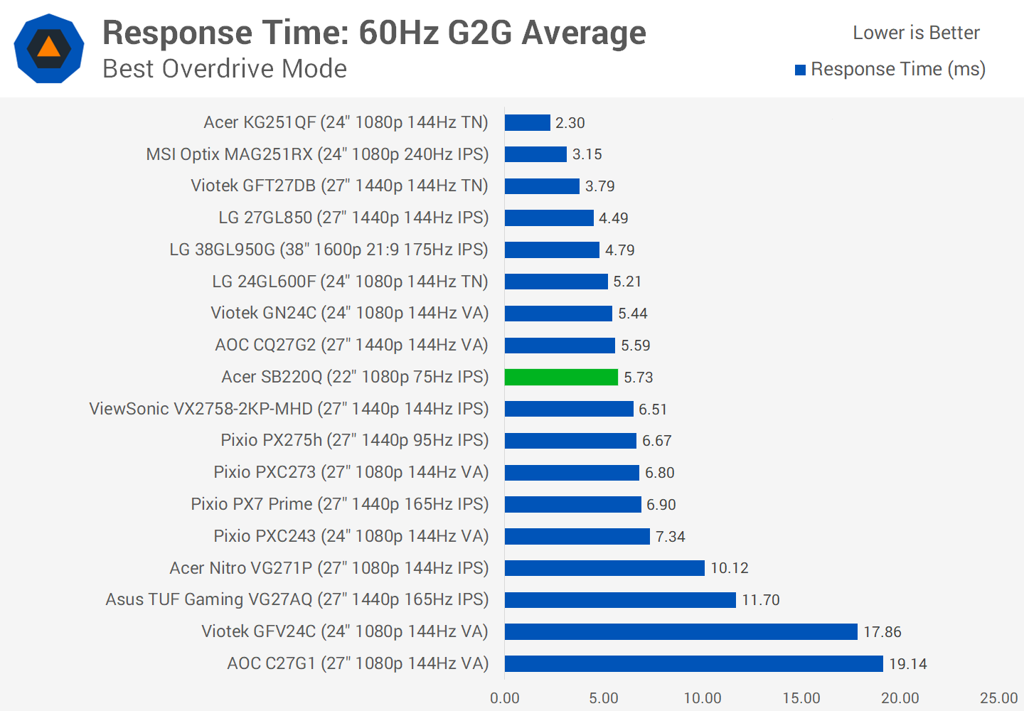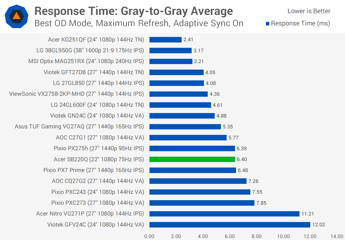Comment le SB220Q se compare-t-il aux autres moniteurs 1080p que nous avons testés? Eh bien, en termes de gris à gris moyen en mode Overdrive Normal, 6,40 ms n'est pas trop mal pour un moniteur IPS. Nous obtenons des performances de niveau sombre décentes, en battant certaines autres options VA bon marché comme le Pixio PCX243, par exemple. La conformité du temps de réponse à l'aide de ce mode est également très bien, comme vous l'espérez avec un taux de rafraîchissement de 75 Hz.