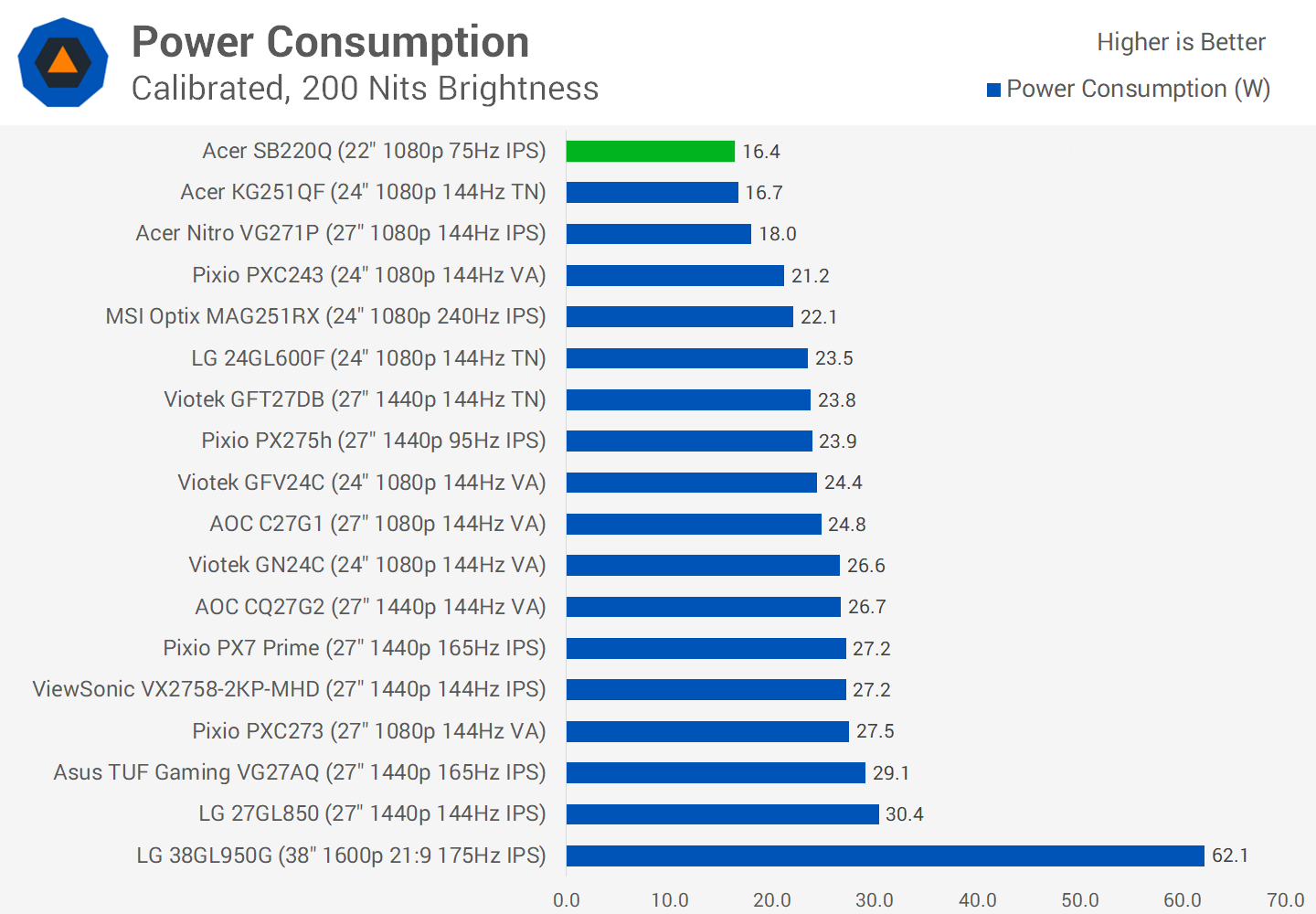 La consommation d'énergie est faible à environ 16 W, mais pas beaucoup moins que certains moniteurs de 24 pouces que nous avons testés. Pourtant, si la production de chaleur est un problème, le SB220Q est d'or dans ce domaine.
