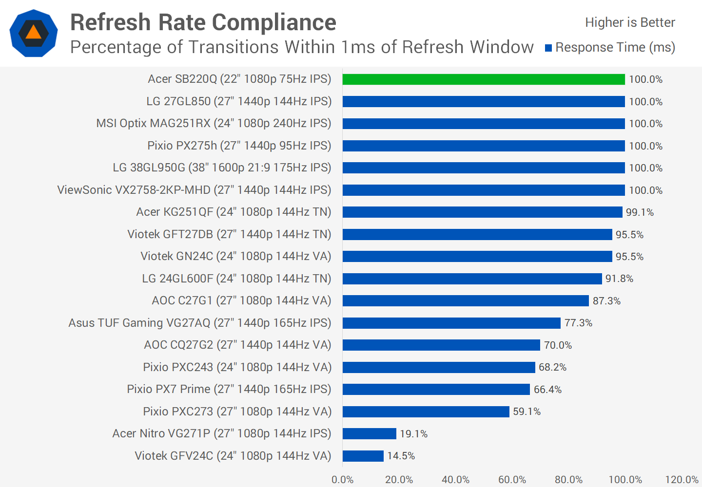 Avec les bas prix d'aujourd'hui pour les moniteurs 144 Hz 1080p, nous ne pensons pas que le SB220Q offre beaucoup pour son argent en tant qu'écran de jeu. Les Viotek GN24C, PXC243 et AOC C24G1 sont tous de 140 $ à 160 $. C'est ~ 60% plus cher que le SB220Q, mais ce que vous obtenez est au moins deux fois plus rapide et deux fois plus efficace pour la gestion des mouvements.