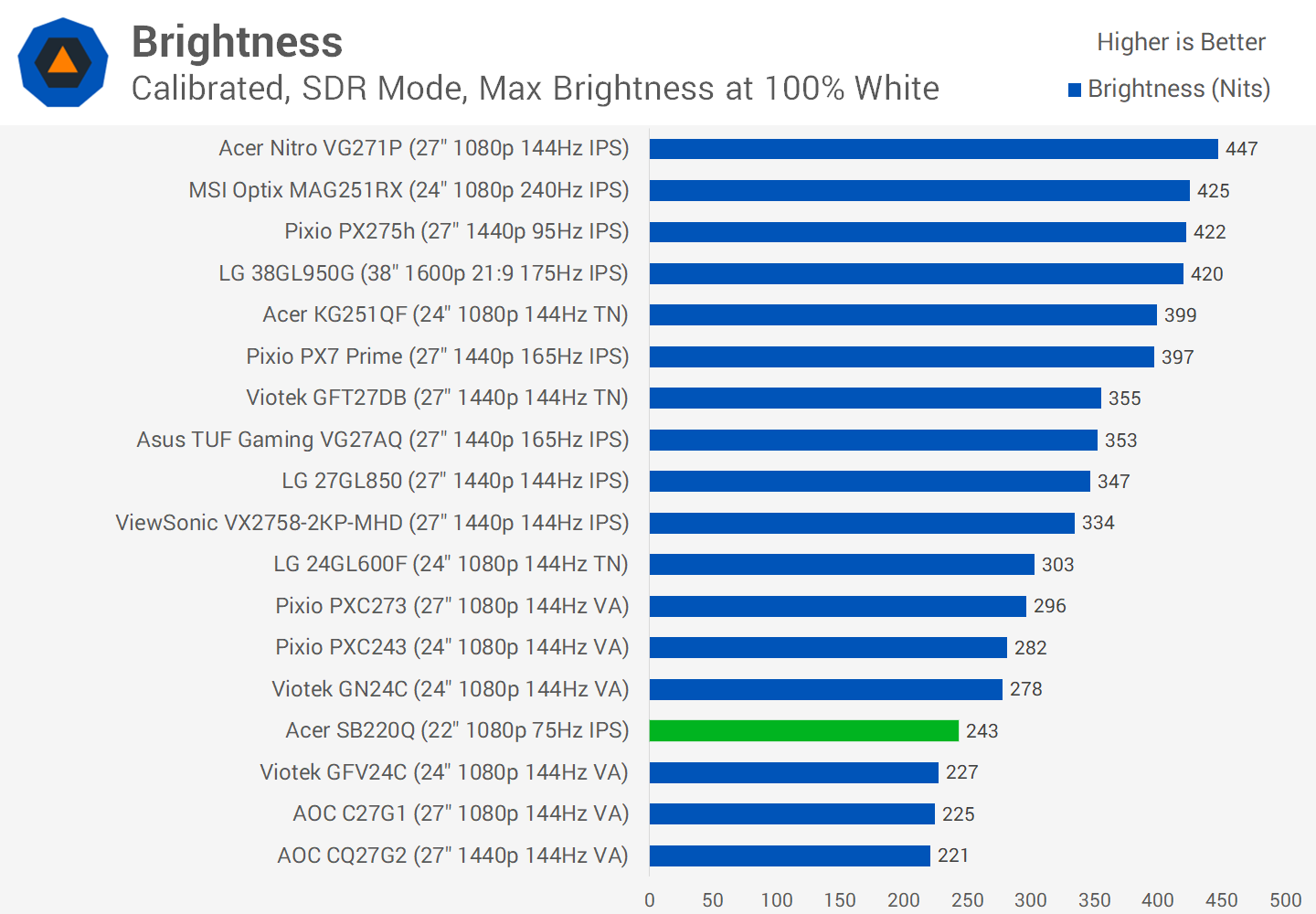 La luminosité du SB220Q est médiocre à 240 nits après l'étalonnage, mais pas trop loin de la plupart des moniteurs économiques. C'est encore assez lumineux pour la plupart des cas d'utilisation, mais si vous avez un environnement de visualisation très lumineux comme une pièce ensoleillée, cela pourrait ne pas être suffisant.