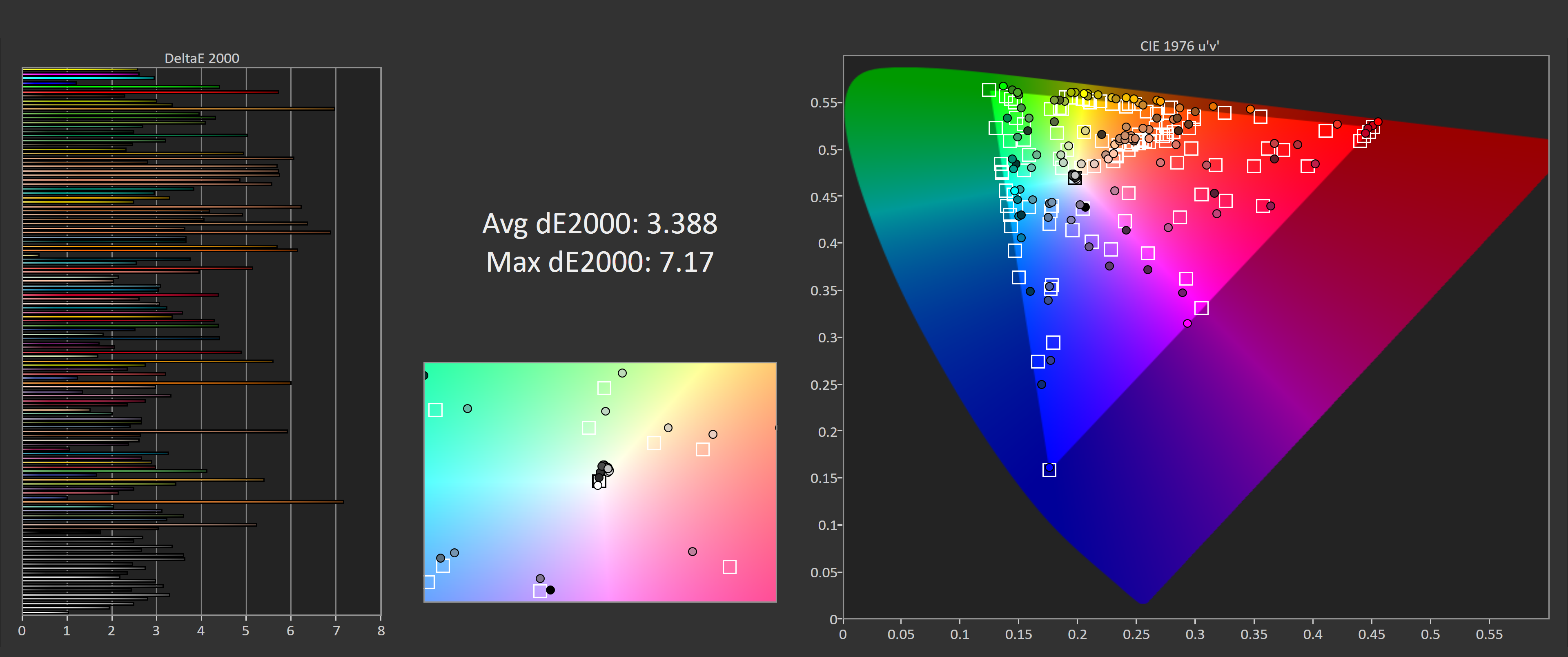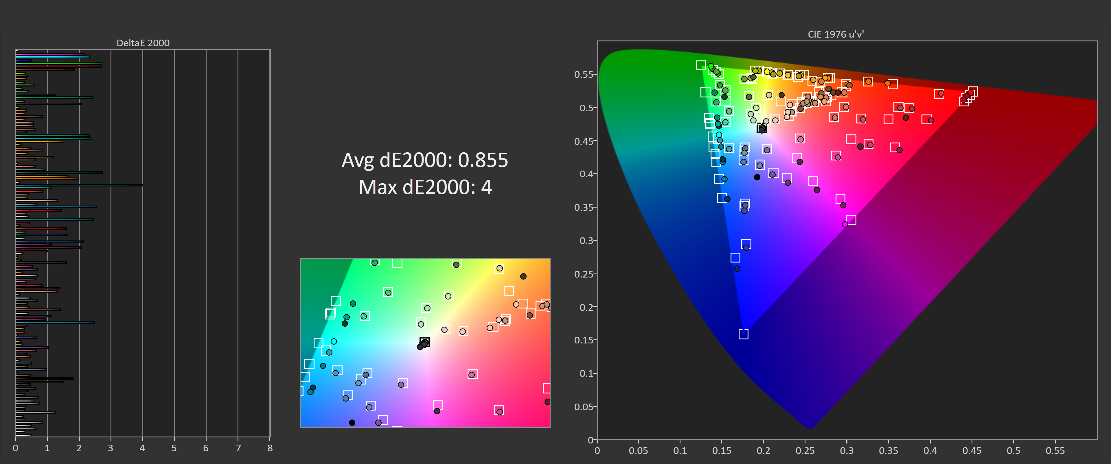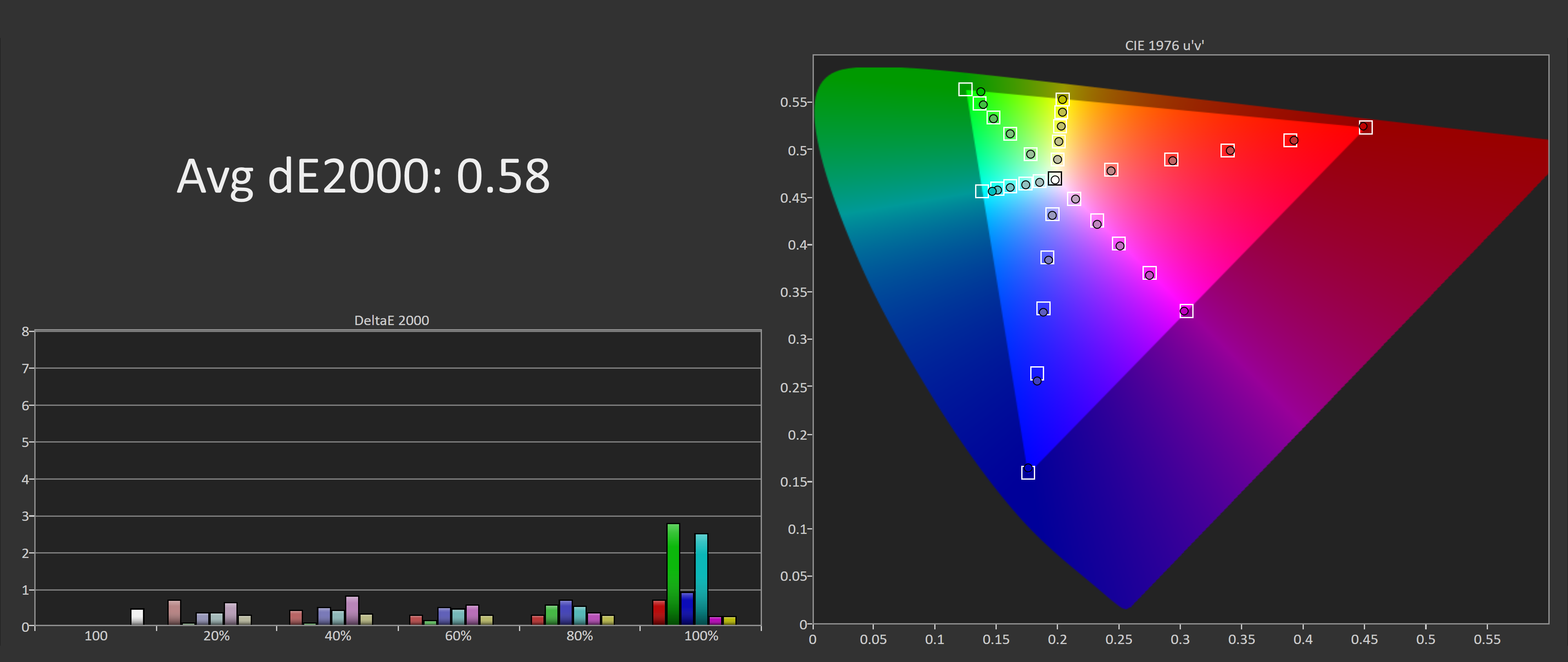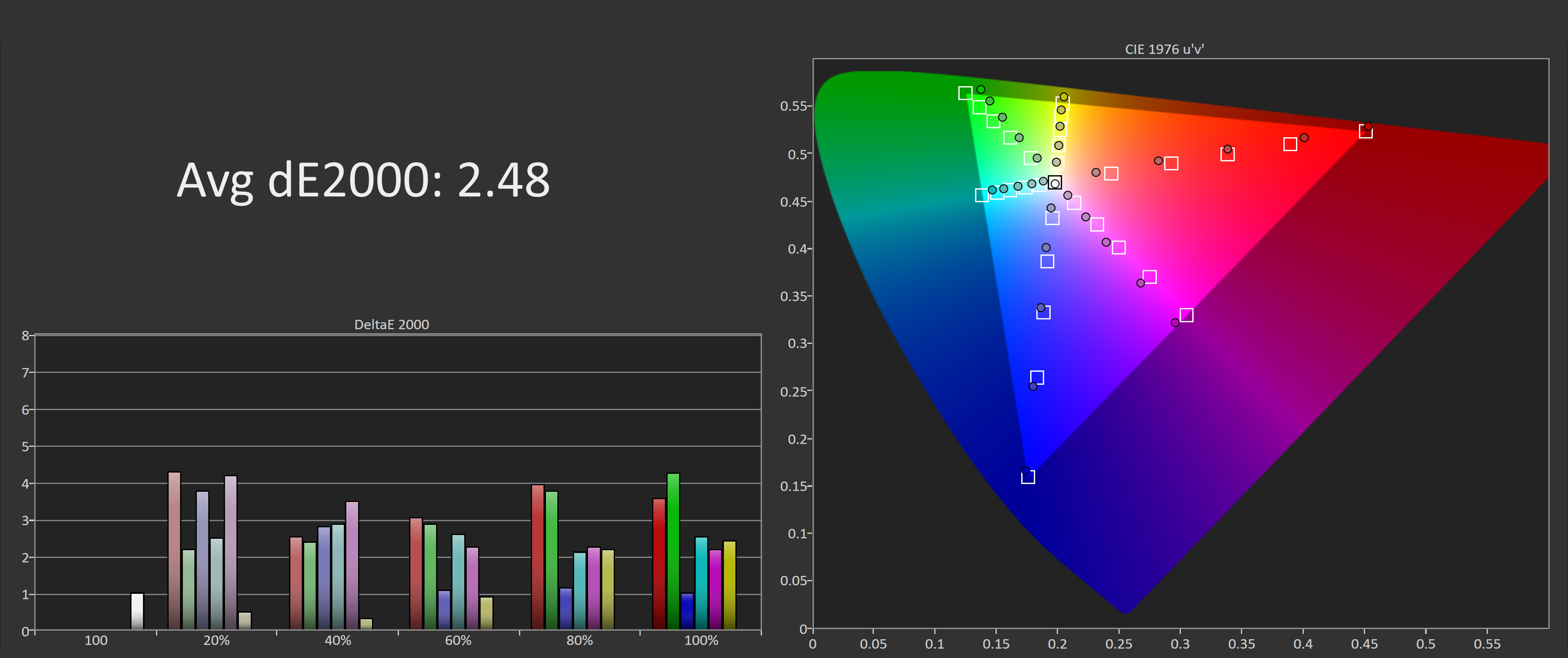 Les performances de saturation sont similaires avec une moyenne deltaE de 2,48, principalement limitée par certaines bizarreries avec les rouges et les verts. Le panneau utilisé ici ne peut pas tout à fait atteindre une couverture 100% sRGB, nous sommes plus à 93%, donc il y a un peu d'écrêtage avec des verts, mais les performances globales sont solides même si nous nous retrouvons avec une moyenne de 3,39 deltaE dans ColorChecker.