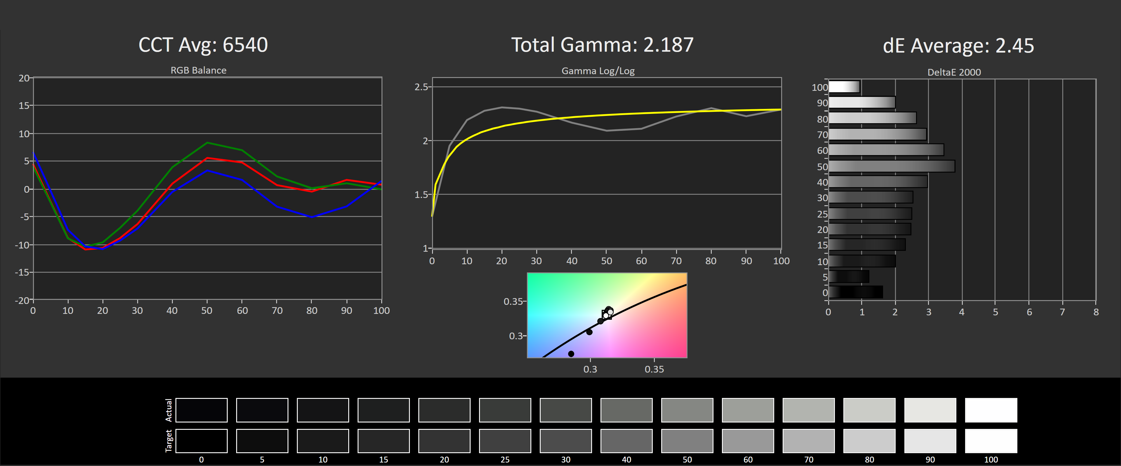 L'étalonnage prêt à l'emploi est décent, ce qui est une bonne nouvelle pour les acheteurs après une excellente expérience de couleur. Notre unité avait des niveaux de blanc presque parfaits, et bien que cela ait légèrement diminué lors du déplacement dans le reste de l'échelle de gris avec une teinte jaune mineure, ce n'était pas si visible et dépassait de loin mes attentes d'un moniteur bon marché. Un deltaE en niveaux de gris de 2,45 n'est pas parfaitement précis, mais très bon dans cette catégorie de prix.