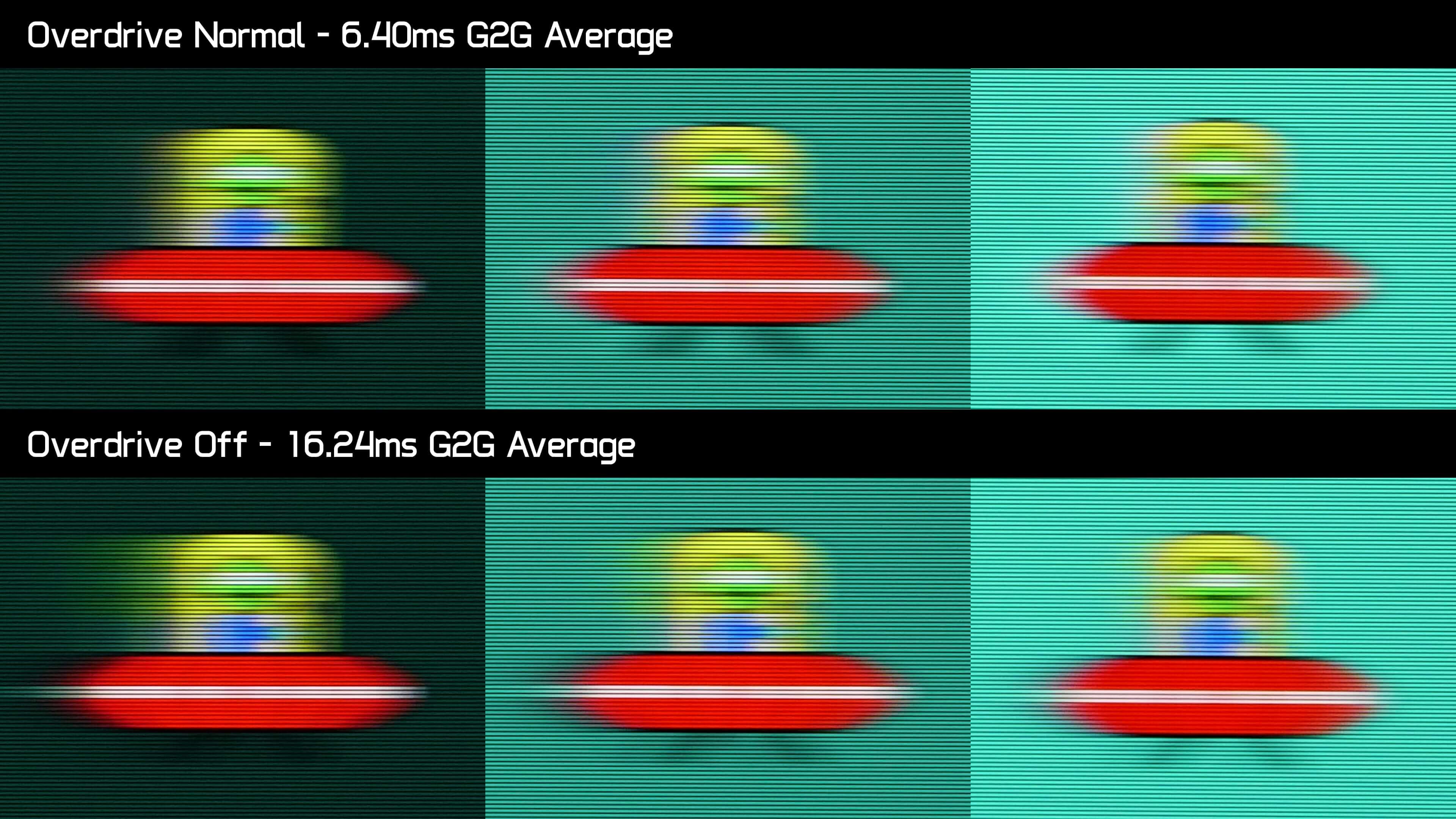 Lorsque nous regardons des images de caméra de poursuite à l'aide du test UFO de Blur Buster, qui simule la façon dont l'œil humain voit le mouvement sur cet écran, vous pouvez le voir en action et comment ni Off ni Normal offrent une expérience formidable. Le départ est très lent avec d'énormes quantités de fantômes et de bavures, avec des traînées derrière l'OVNI en mouvement. Mais ensuite avec Normal, ces traînées fantômes sont remplacées par des images fantômes inverses, une traînée lumineuse qui, dans certaines circonstances, est plus visible que la traînée floue.