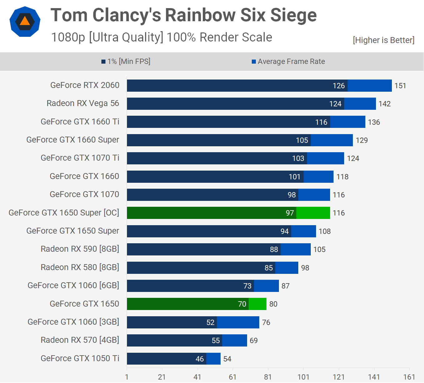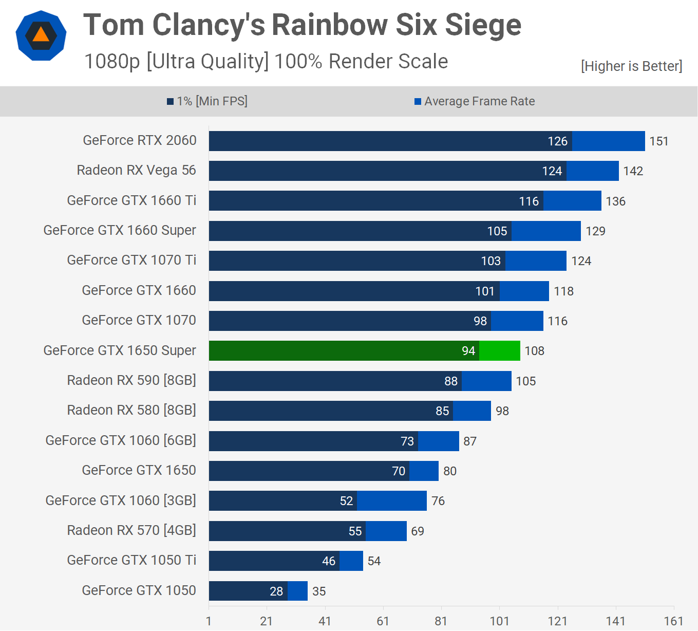 Les performances de Rainbow Six Siege ont été augmentées de 7%, ce qui a permis à la 1650 Super d’être à la hauteur de la GTX 1070. C’est assez étonnant pour une carte graphique de moins de 200 $.