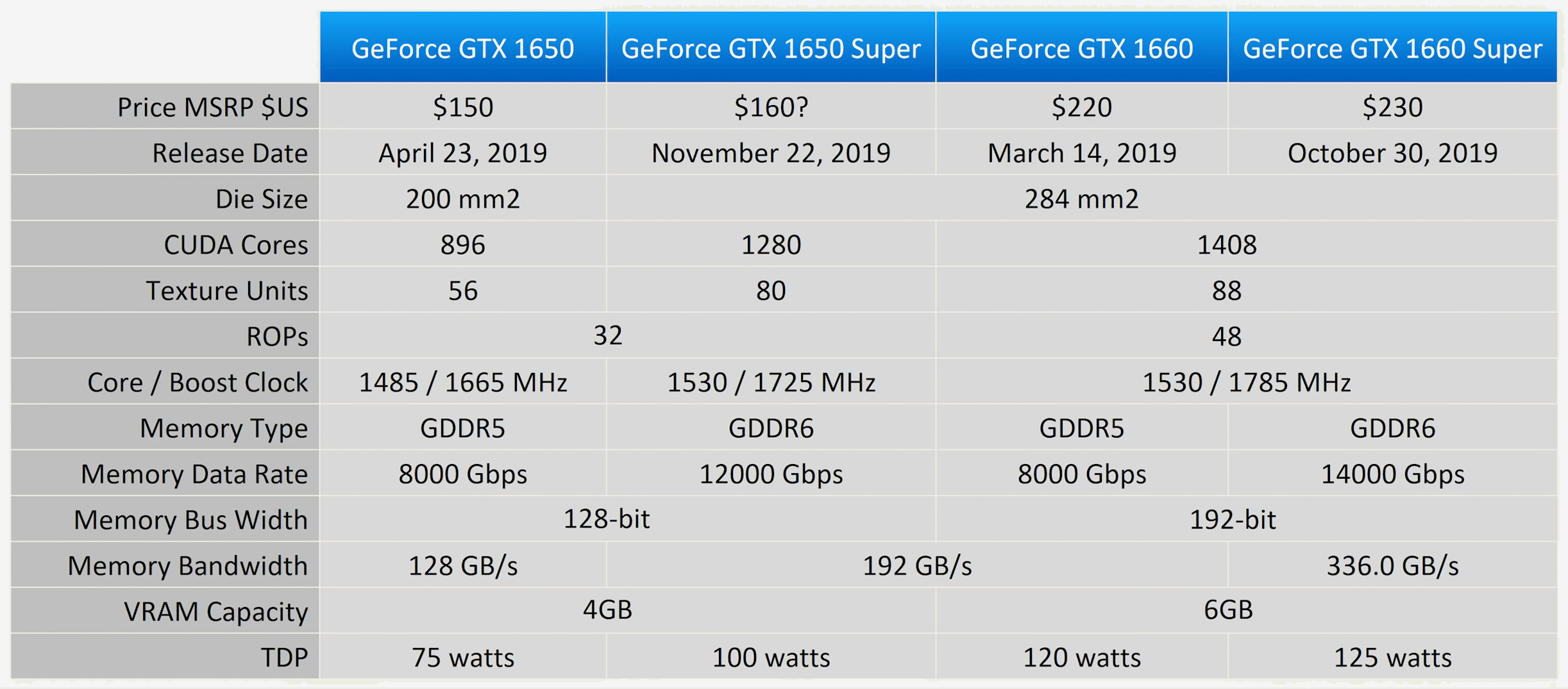 Cela signifie que, comparée au modèle de base 1650, la nouvelle version Super contient 43% de cœurs et d'unités de texture en plus, mais le même nombre de ROP. Le Super bénéficie toujours de 50% de bande passante en mémoire supplémentaire car il reçoit une mémoire GDDR6 de 12 Gbps, tandis que le 1650 d'origine est livré avec 4 Go de mémoire GDDR5 de 8 Gbps. En bref, les mises à niveau de 1650 Super incluent 43% de cœurs supplémentaires et 50% de bande passante supplémentaire, semble être une aubaine pour une augmentation de prix d’environ 7%, mais nous discuterons de la tarification vers la fin de l’article.