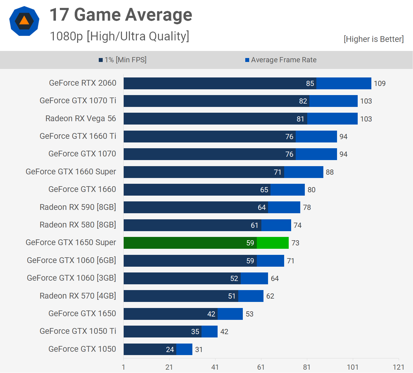 Le 1650 Super avait fière allure dans tous ces jeux, mais pour avoir une très bonne idée de la façon dont il se superpose, regardons la cadence moyenne des 17 jeux testés en 1080p.