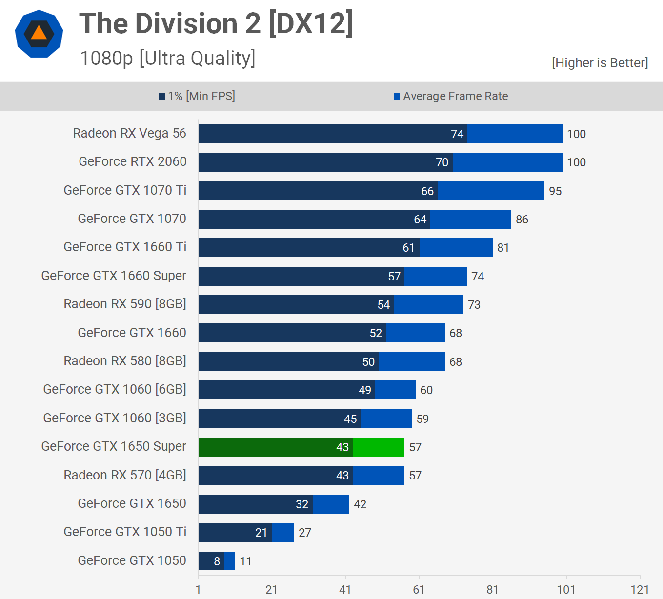 Ensuite, nous avons The Division 2 et ici, le 1650 Super n’a en moyenne que 57 images par seconde, ce qui le place au même niveau que le RX 570 et à quelques images de la série GTX 1060. Malgré cela, elle était toujours 36% plus rapide que la 1650 standard, bien qu’elle devance également la GTX 1660 avec une marge de 17%, ce qui reste une performance globale décente à 1080p.