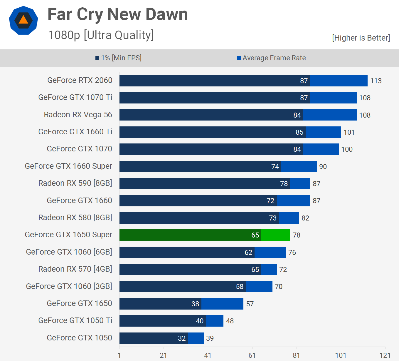 Alors que la GTX 1650 se débattait dans le Far Cry New Dawn à 1080p, avec une moyenne de seulement 57 images par seconde et un minimum de 1% en dessous de 40 images par seconde, la 1650 Super n’a aucun problème de ce type, affichant une vitesse moyenne de près de 80 images par seconde, soit 37% plus rapide. La faible performance de 1% était également bien meilleure, ne descendant jamais en dessous de 60 fps.