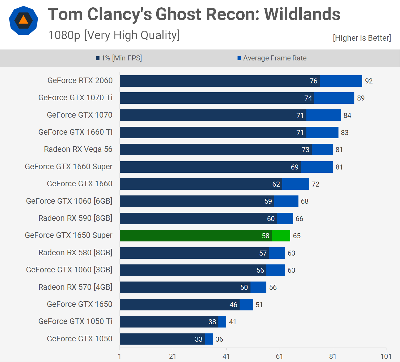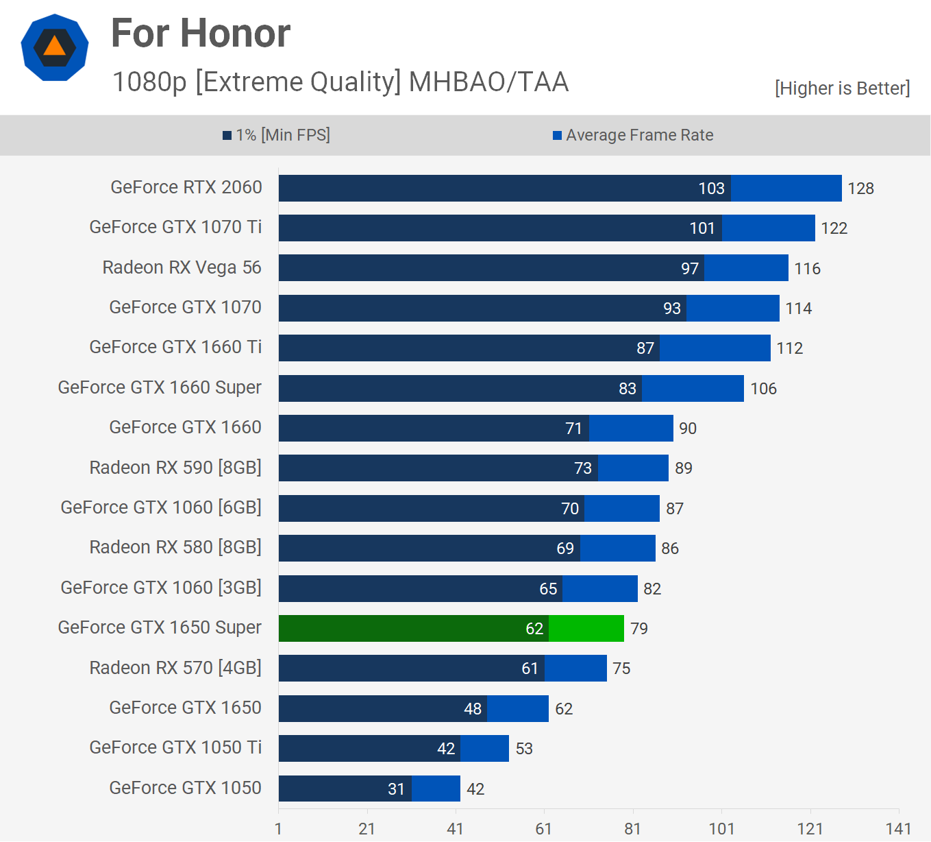 Pour Honor, le 1650 Super augmente la cadence moyenne de 62 images par seconde avec une résolution de 1650 à 79 images par seconde, ce qui représente une bonne performance de 27%. Cela signifiait également que le 1650 Super était de quelques images plus lentes que le RX 570 et de quelques images plus lentes que le RX 580.