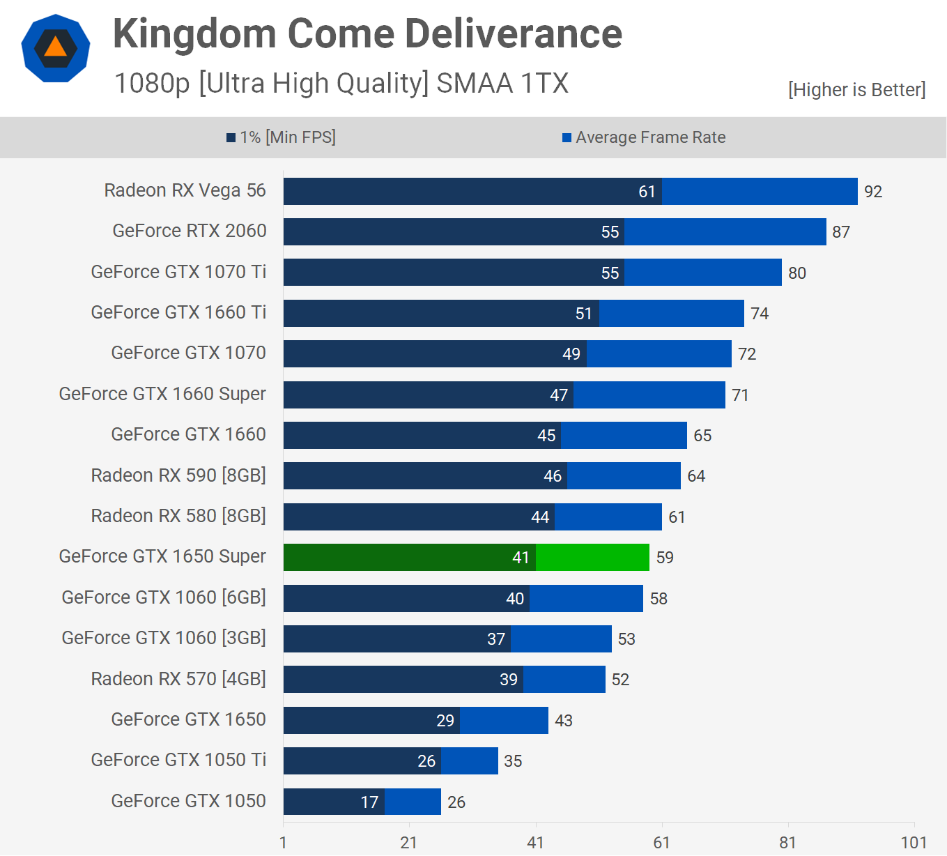 La performance dans Kingdom Come Deliverance n’est pas extraordinaire en 1080p, bien que ce ne soit certainement pas mauvais par rapport à la concurrence. Ici, la 1650 Super n’avait que quelques images de moins sur le RX 580 et 9% moins vite que la GTX 1660.